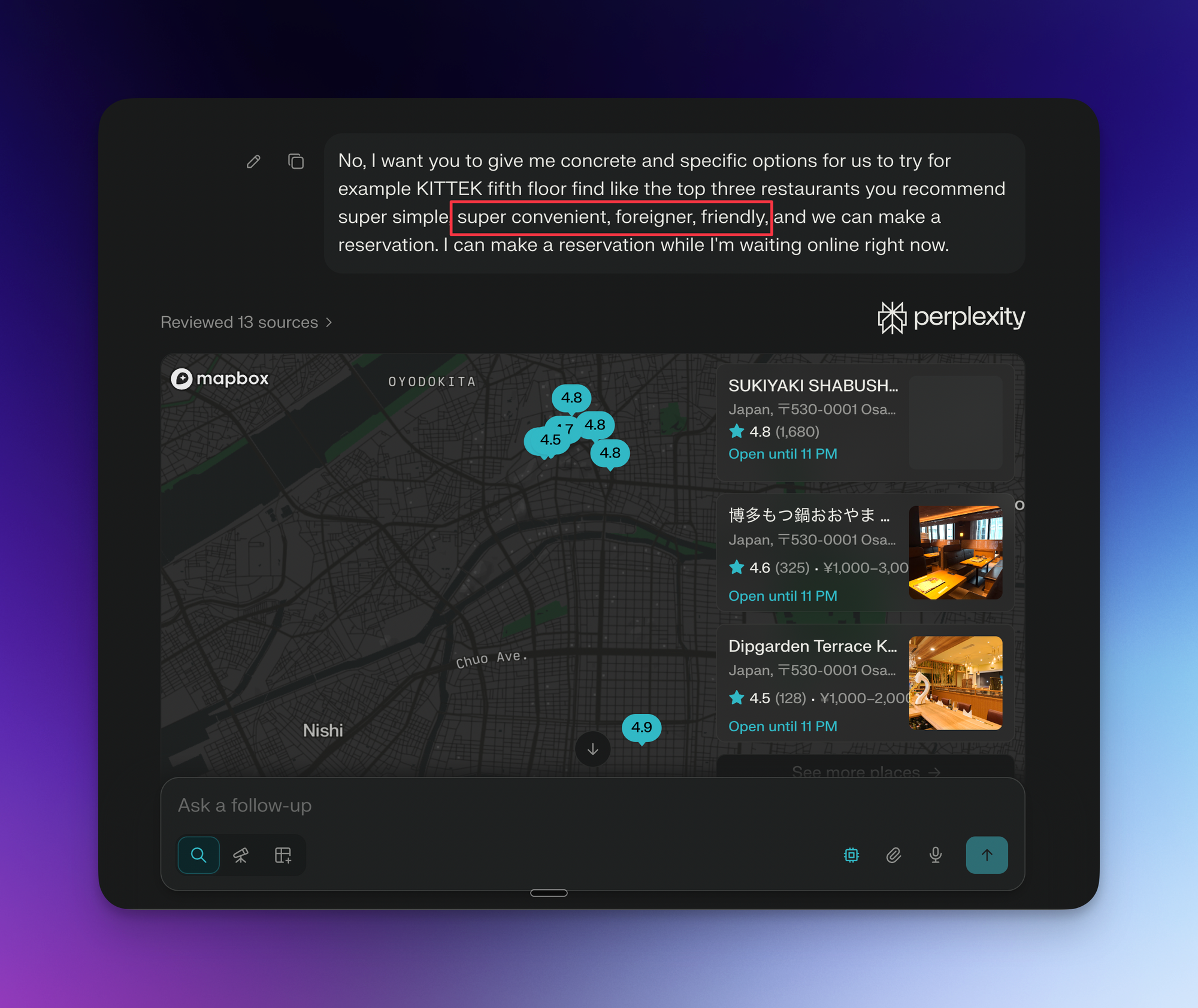 But when I need "grab and go" information, like whether a specific restaurant is foreigner-friendly because we do not speak Japanese, I want Perplexity to give me accurate information within seconds.