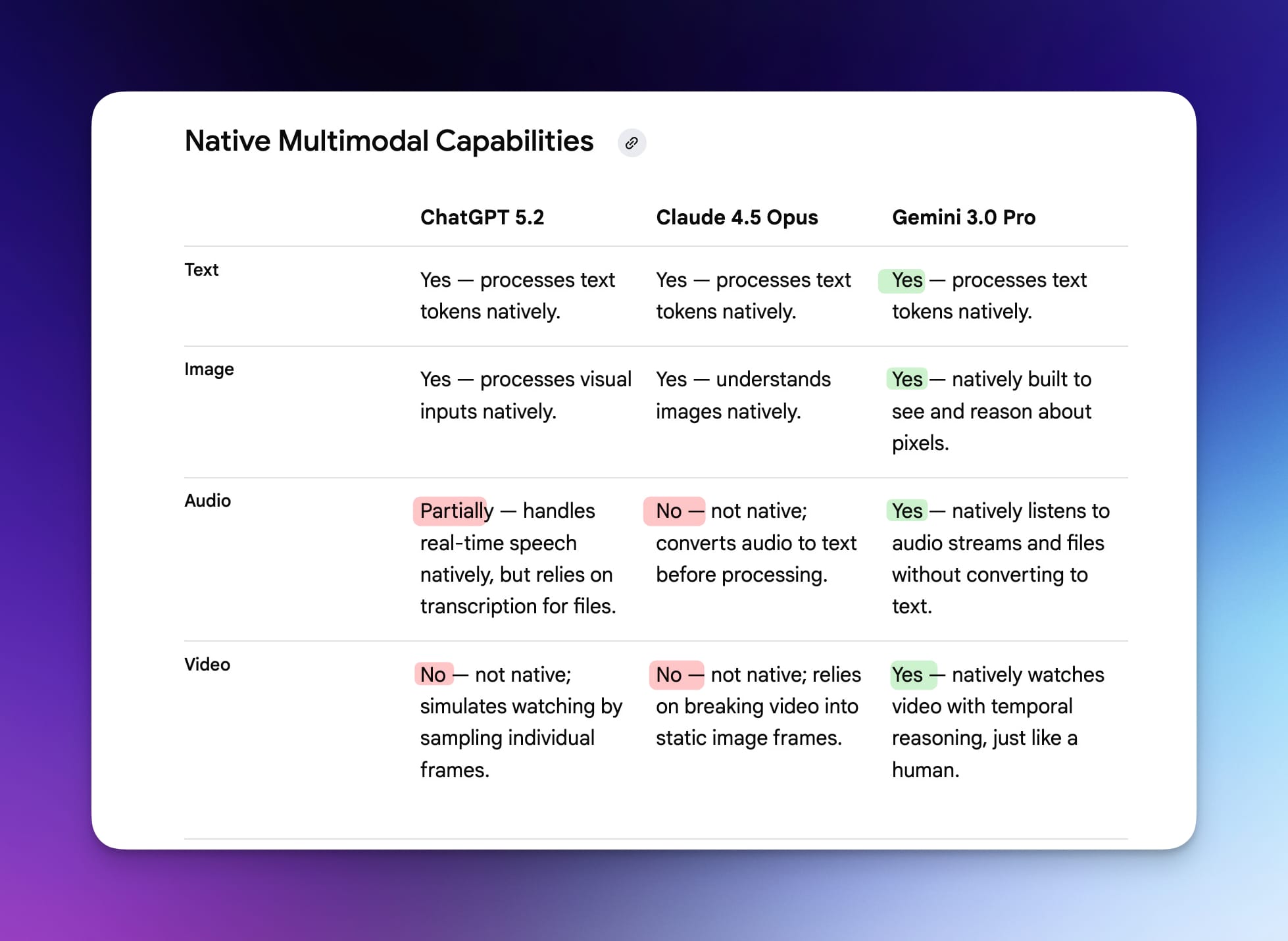 Where ChatGPT wins on obedience, Gemini wins on multimodality. Gemini processes video, audio, images, and text natively. It can "listen" to audio and "watch" videos while ChatGPT and Claude use roundabout methods to access that information.