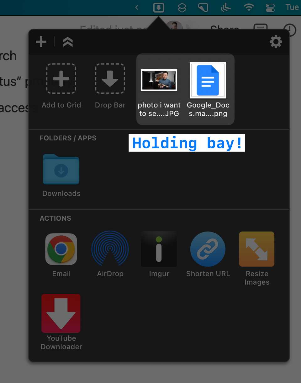 Dropzone 4 is a great tool for managing files. You can drag individual files and combine them into a single package to drop into a messaging app or application. It allows you to combine files with different formats—pdf, png image file, and audio .wave file.