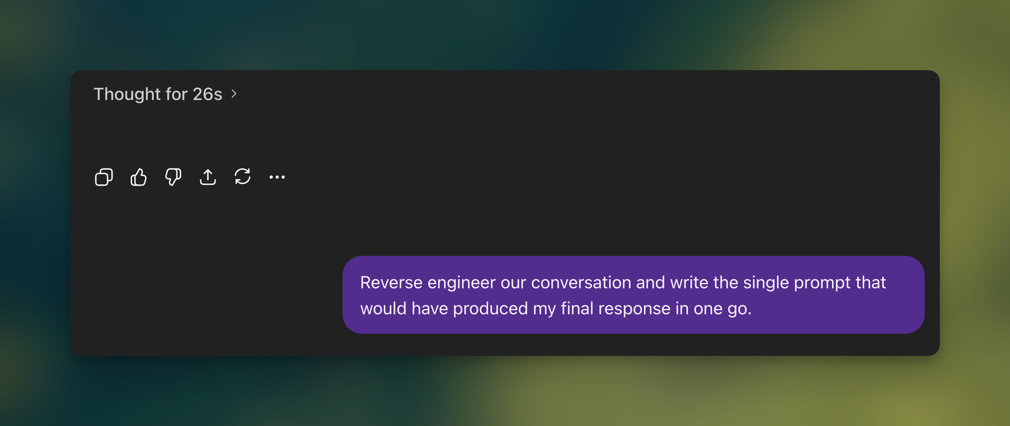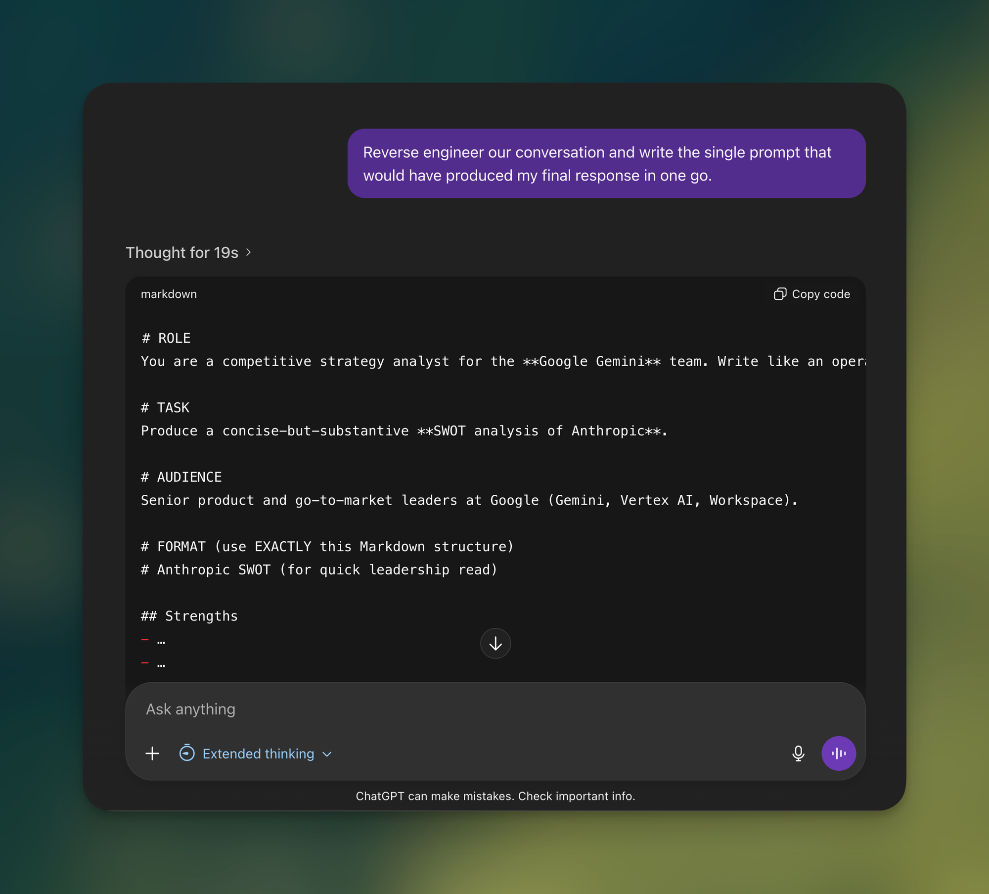 ChatGPT will output the reverse-engineered prompt in a code block for easy copy-pasting. Test it out by pasting it into a new chat. You'll get that perfect, detailed analysis in a single step.