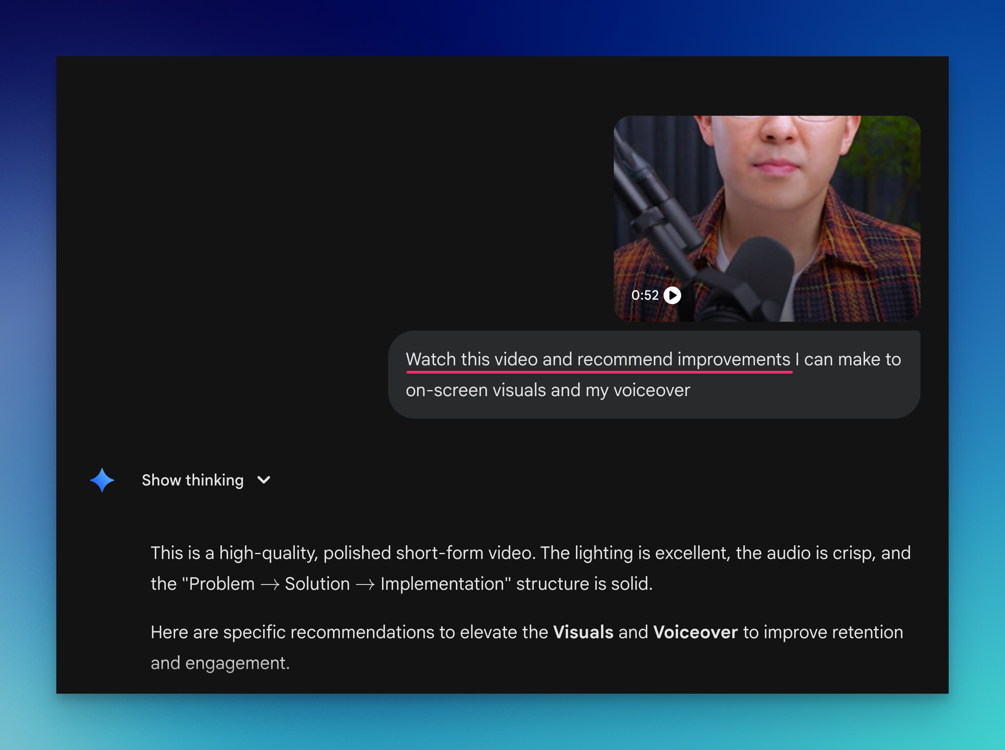 This capability allows you to upload a short-form video and ask Gemini to watch it and output specific recommendations.