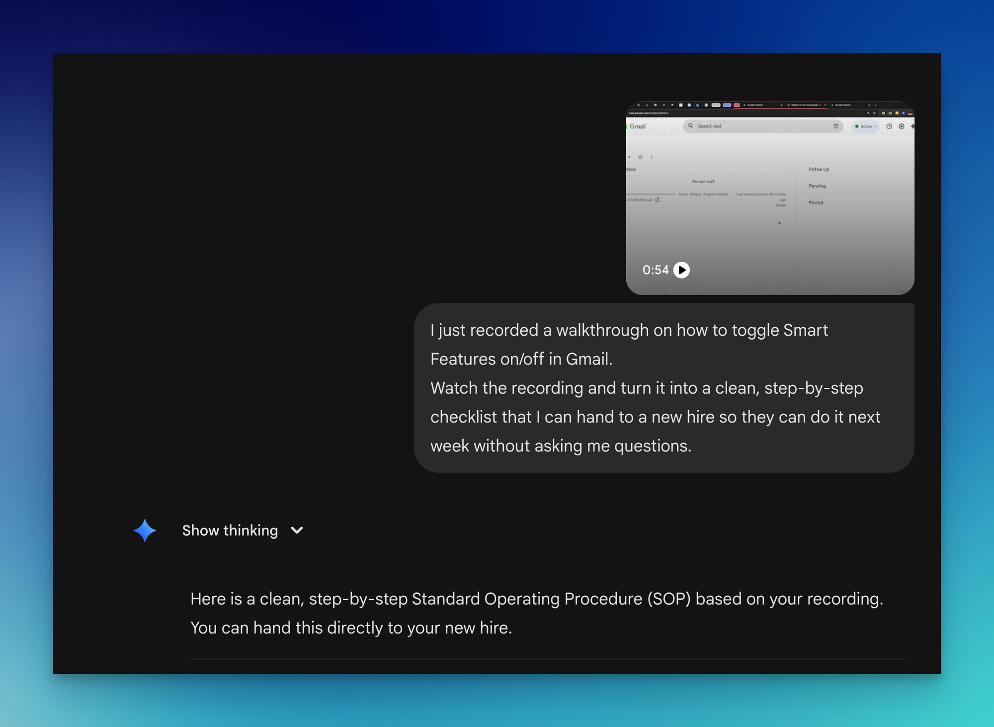 Here's a real-world example: You can upload a screen recording of a technical task and ask the model to turn it into a clean, step-by-step checklist for a new hire. In under 60 seconds, you convert a messy recording into a permanent training asset.