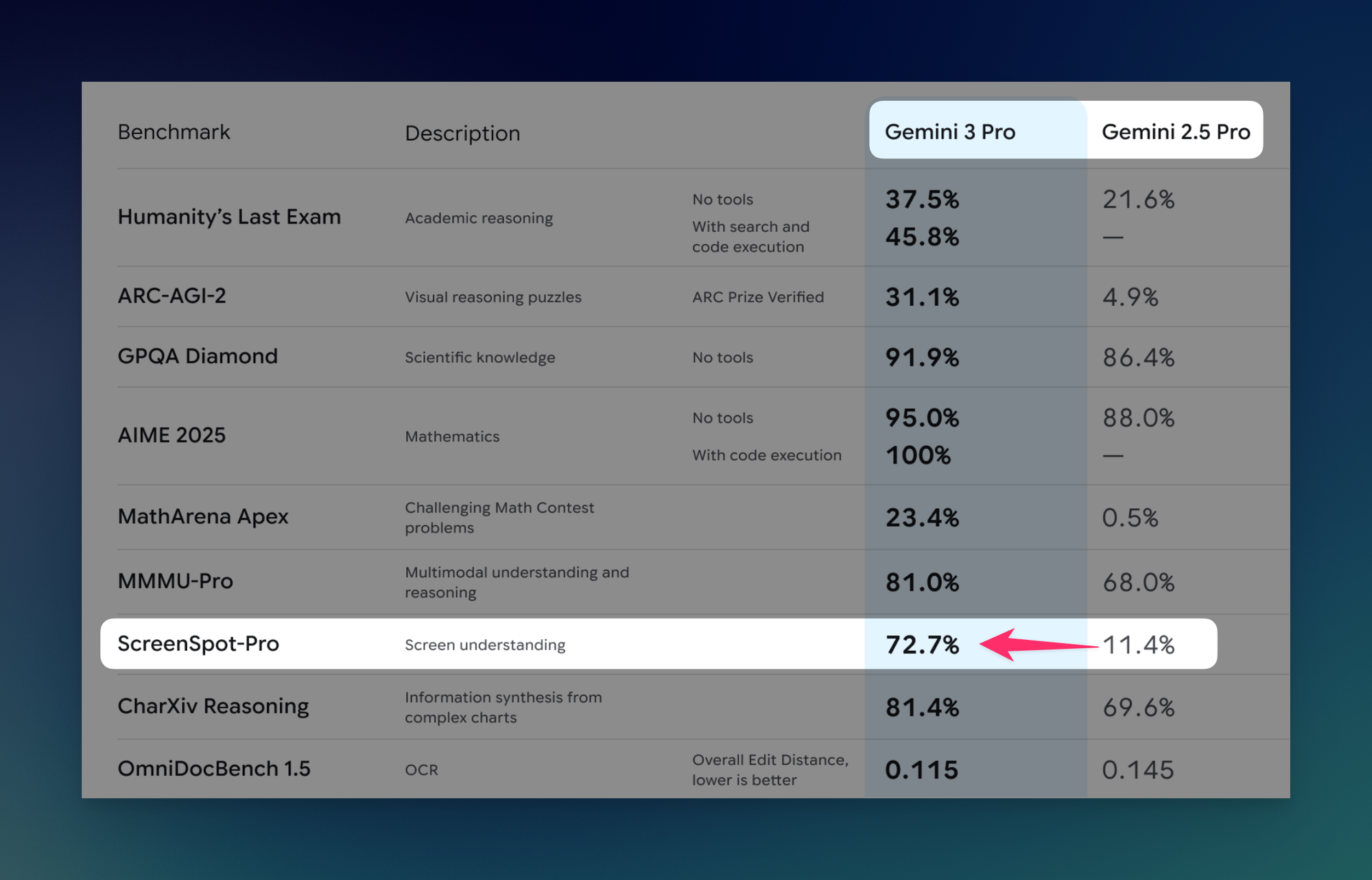 Gemini 3 scored 72.7% on the ScreenSpot-Pro benchmark, a massive leap from the previous 11.4%. This indicates a strong ability to understand user interface layouts.