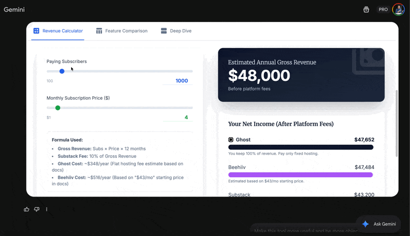 If you upload pricing pages for different software platforms and ask for a comparison, enabling "Dynamic View" creates a fully functional interactive tool. You get a calculator where you can move sliders to estimate revenue or costs in real time. Instead of manually reformatting AI output, the data arrives in a format you can use immediately.