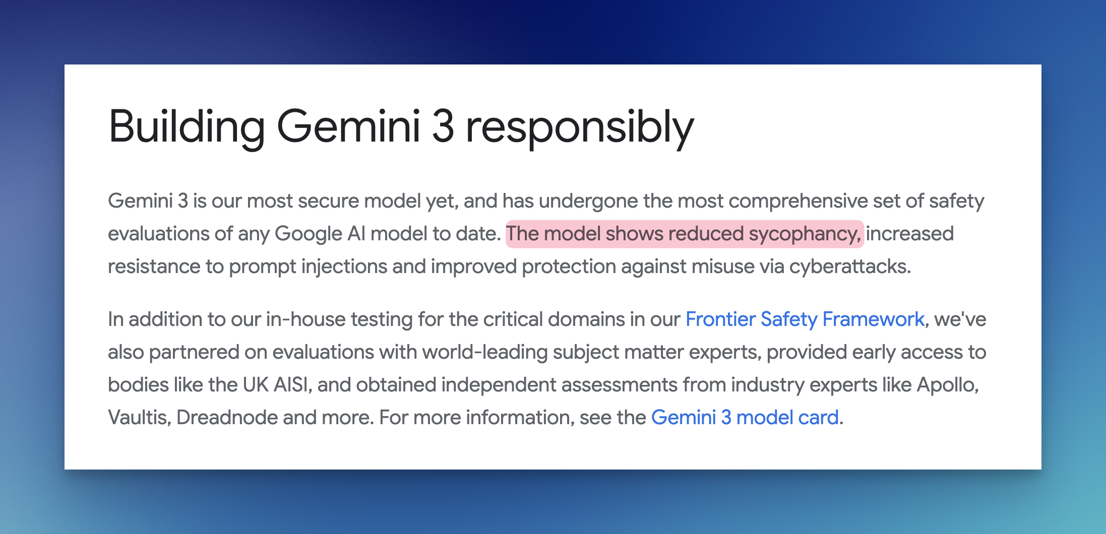 Google explicitly trained Gemini 3 to be less agreeable. The model is now more willing to tell you when you are wrong.