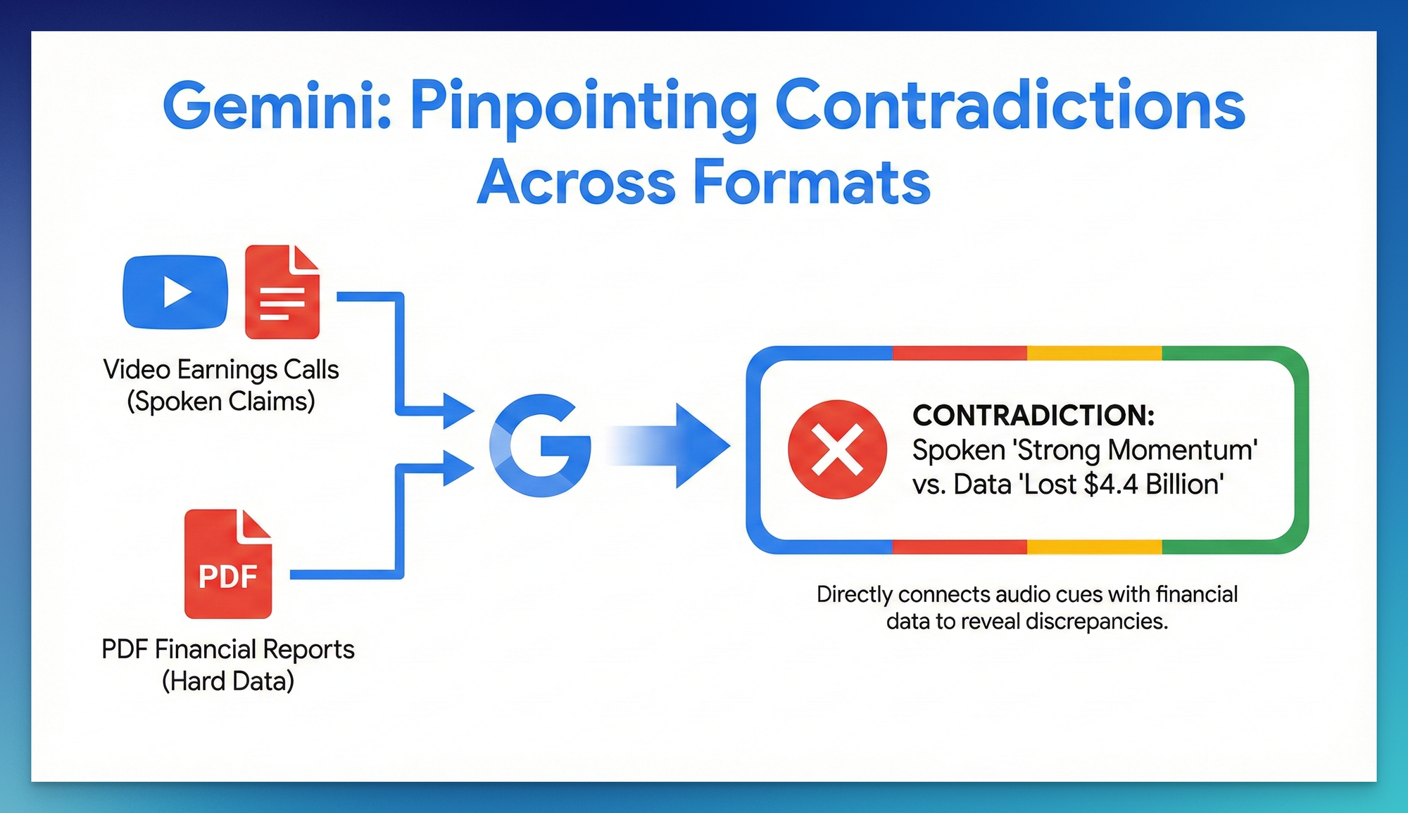 The model can identify that an executive claims "strong momentum" in a video call, while simultaneously flagging that the financial data shows that specific segment lost billions of dollars. It connects the qualitative statements with the quantitative reality.