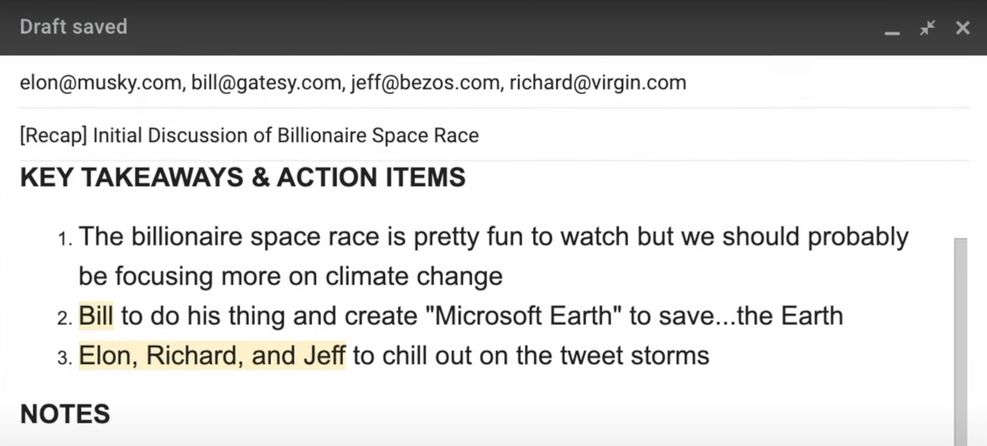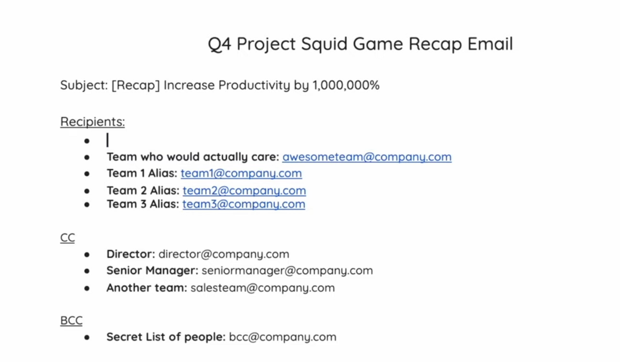 If the email includes notes for those who missed the meeting, place them at the bottom as optional reading. This keeps the focus on essential details while providing additional context for those who need it
