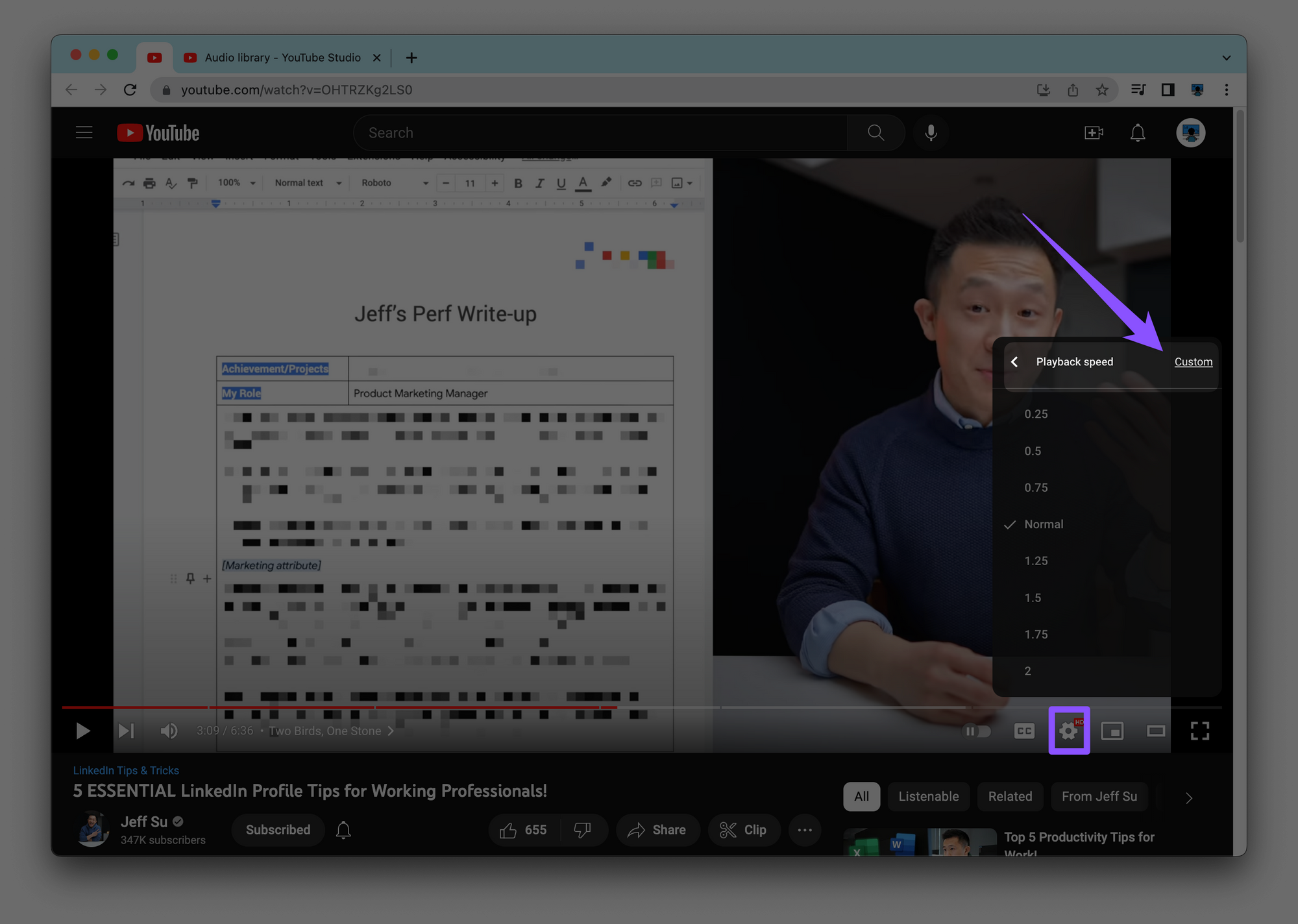 Pro Tip: Click on the settings icon at the bottom of the video > Playback speed > select “Custom” to change the increments of your playback speed