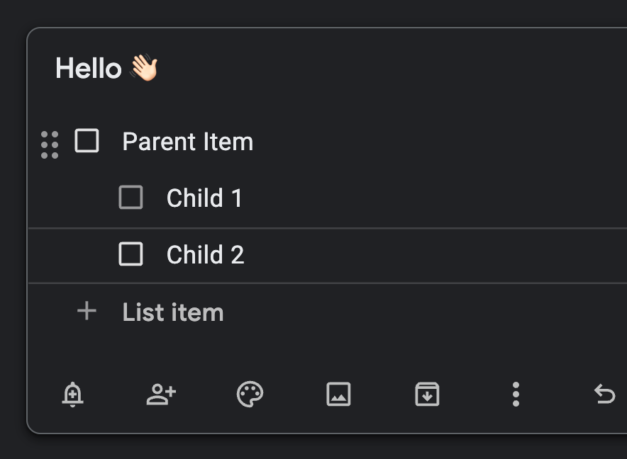 In Google Keep, you can either check off the items on your list individually OR simply check off the “parent” item and the related “children” items will automatically be marked as complete.