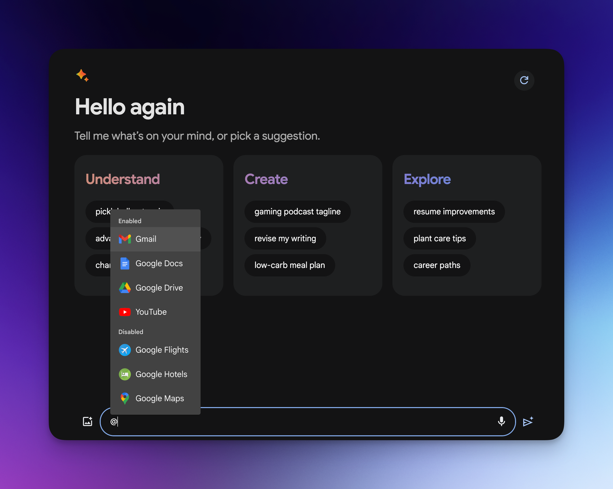 With extensions active, use the "@" command for quick access to Gmail, Google Docs, and Drive.