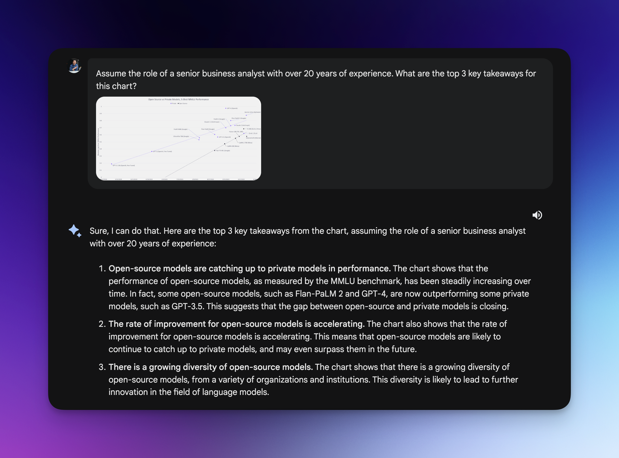 Gemini's image upload feature is a standout, enabling users to extract key insights from complex charts and images.