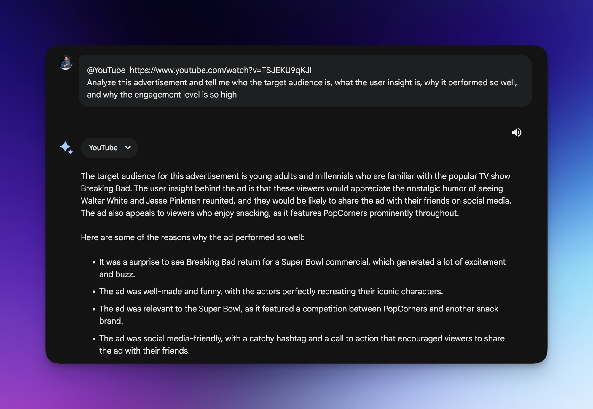While YouTube video recommendations via Gemini might not be the most efficient, Gemini excels in analyzing specific videos, providing insights into target audiences, performance factors, and engagement levels.