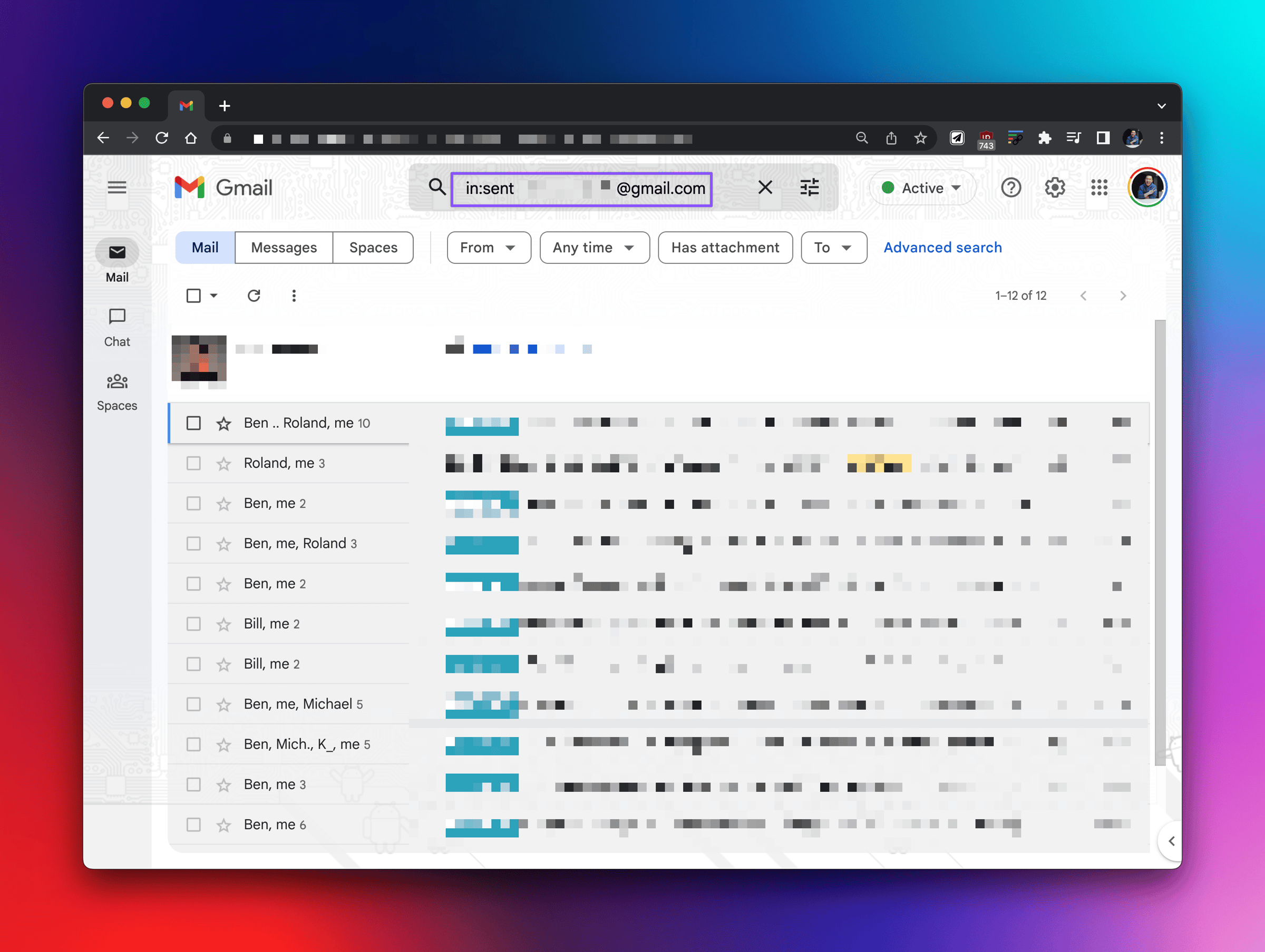 How it works: Use ‘in:sent’ before any keyword or recipient email. For example, ‘in:sent proposal‘ shows all sent emails containing “proposal”. Or get specific with ‘in:sent sarah@example.com‘ to see everything you’ve sent to Sarah.