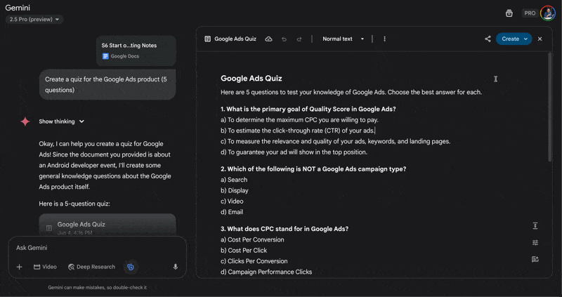Here's something most people don't know: when you start a prompt with "Create a quiz on" while Canvas is enabled, Gemini generates a complete quiz with an answer key at the bottom.