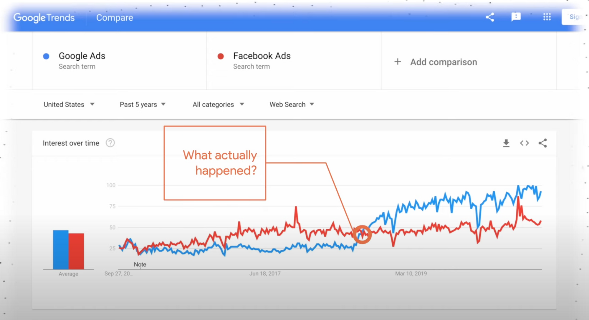 Taking that a step further, let’s say you compare interest for Google Ads to that of Facebook Ads, and you see this following graph: