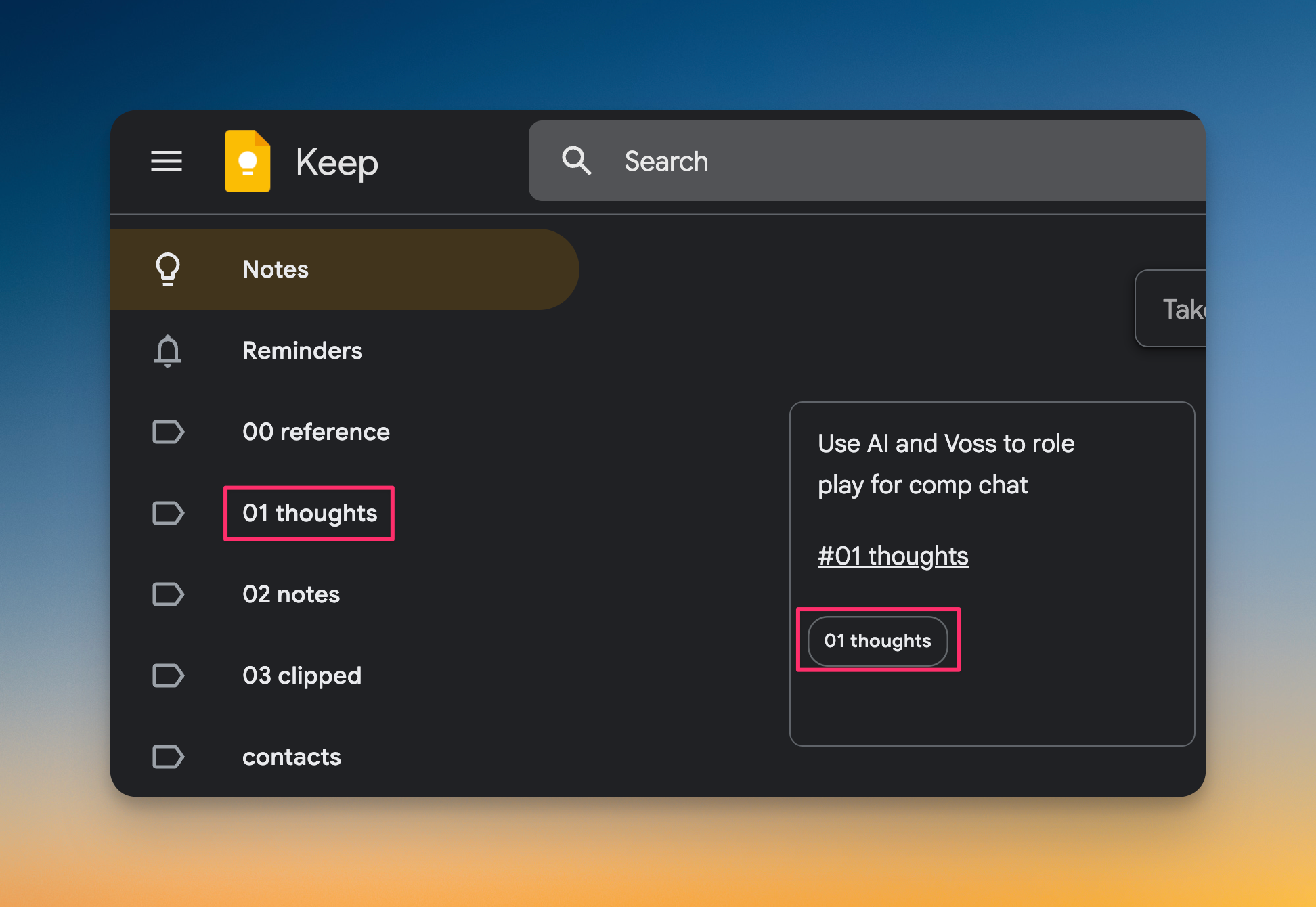 Once information has been captured, you need a lightweight system to sort it for easy processing later. At the moment of capture, you simply tag the note with a label, in this case, "thoughts," and that's it.