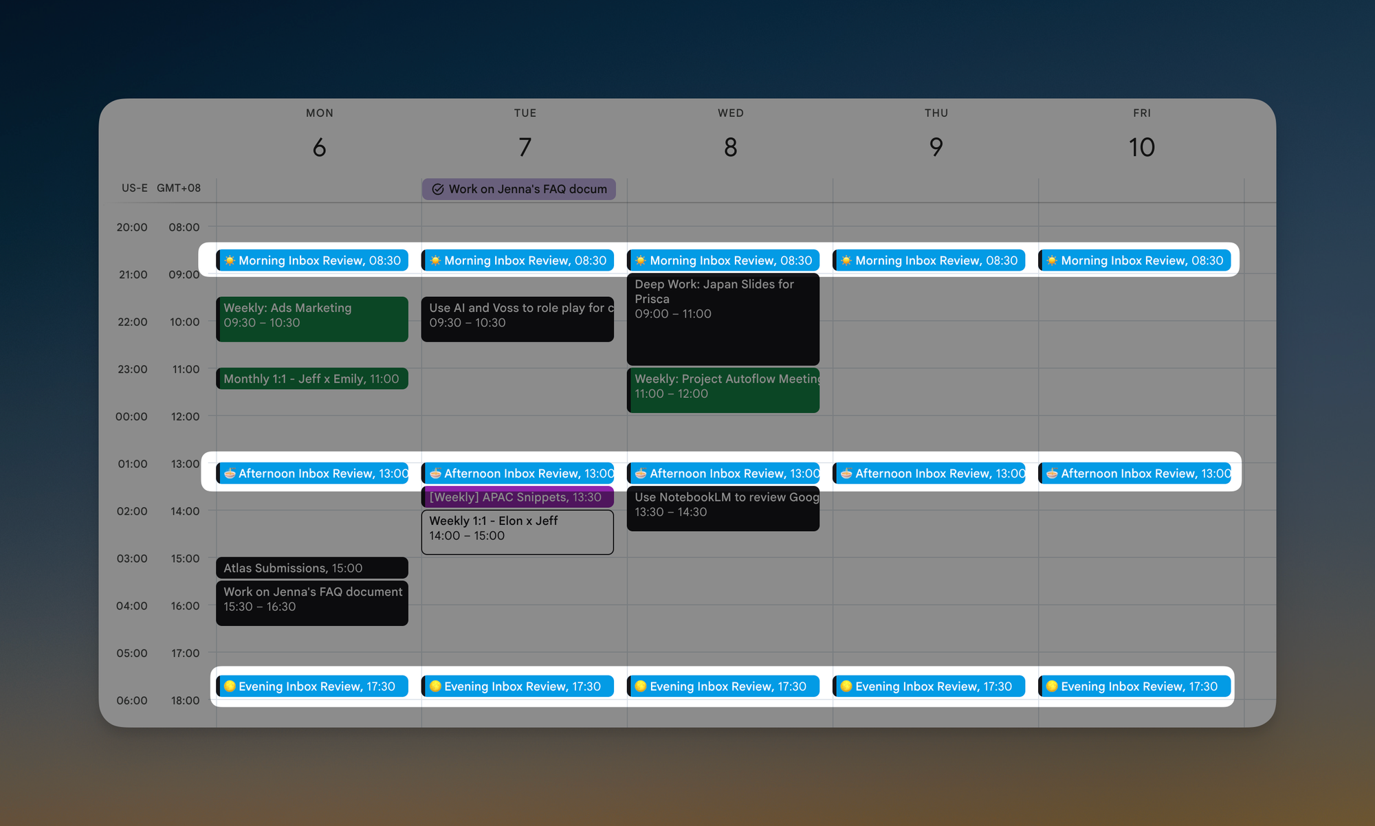 Consider scheduling three 30-minute review blocks daily: one in the morning, one after lunch, and one before you sign off. During these sessions, you have direct links to views showing all your unprocessed information.