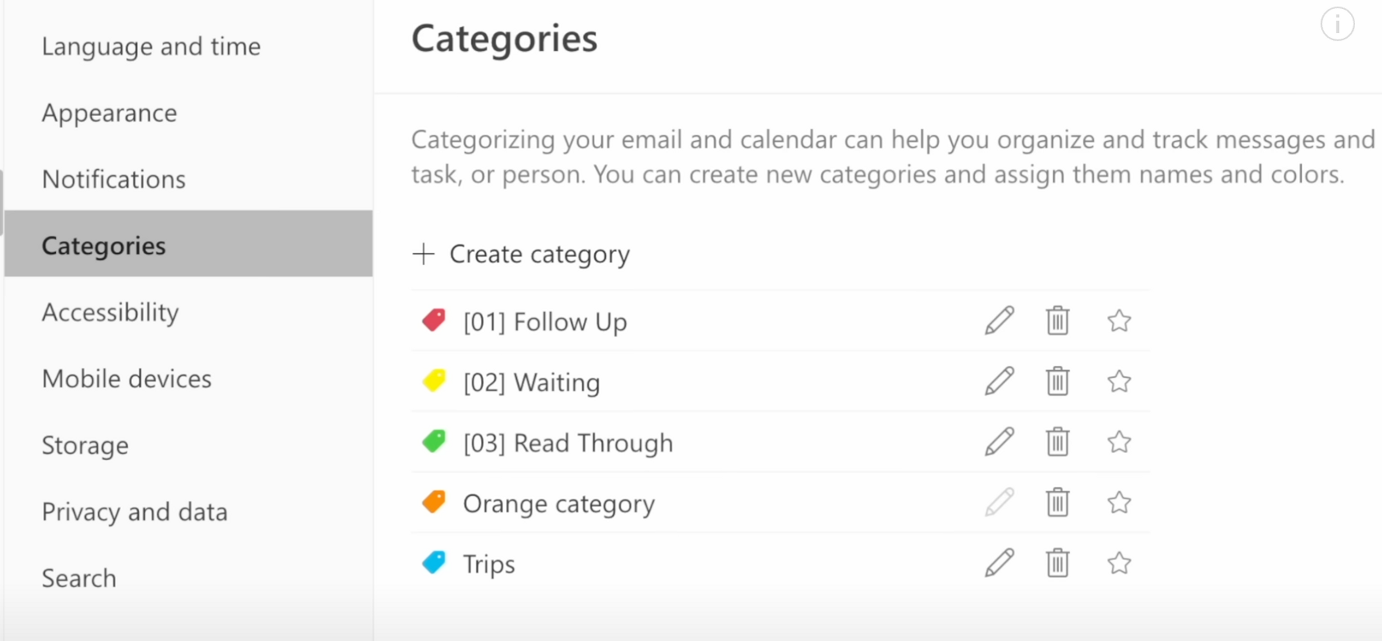 Then, head to the "General" tab > Categories, and create the following five categories: Follow up, Waiting, Read Through, Newsletters, and Trips. You can use brackets and numbers to have these three categories up top.