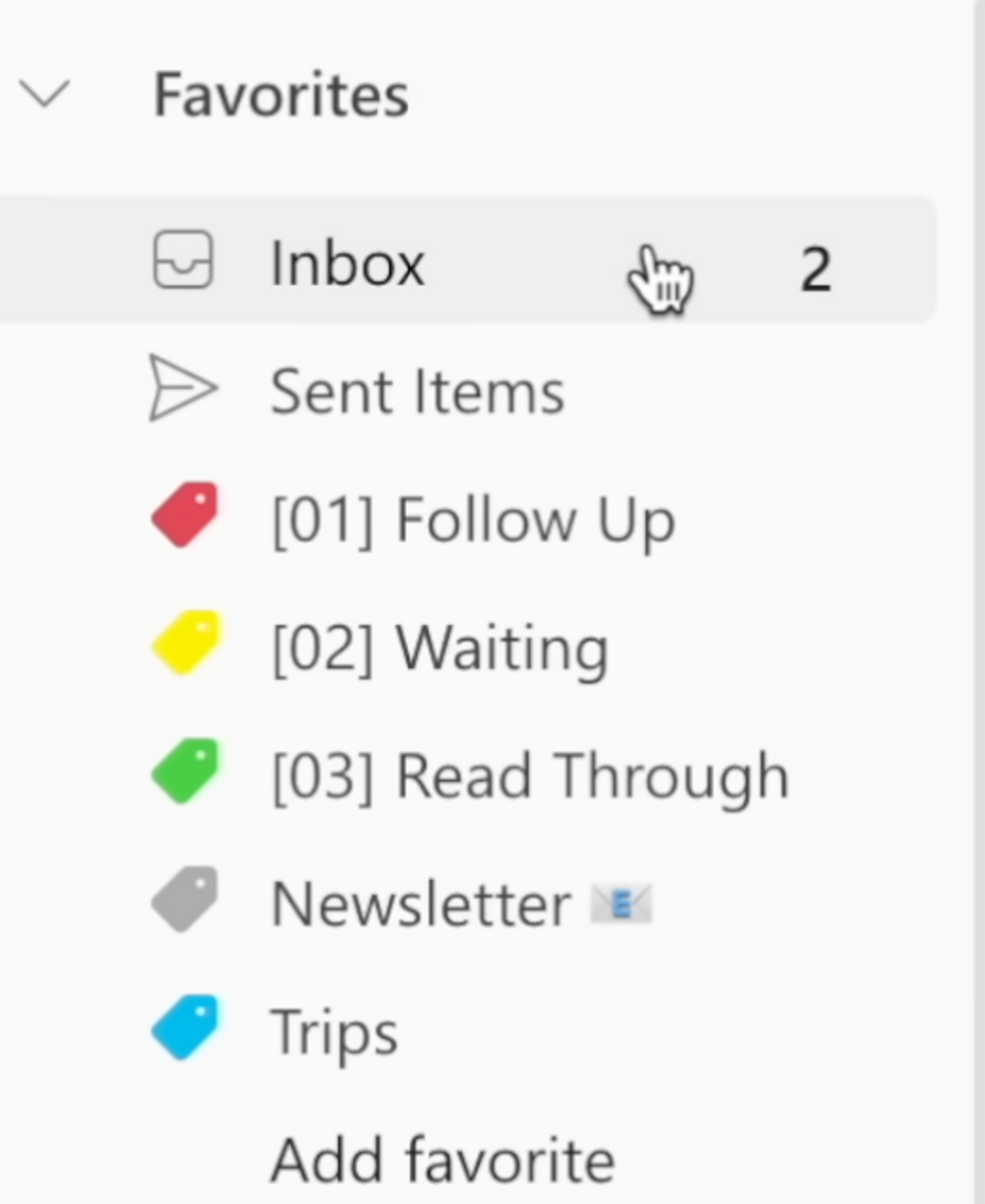 Thirdly, there's no way to view categories in the main inbox without favoriting them. Microsoft's folders feature doesn't work well because emails cannot exist within both the main inbox and a folder at the same time. This defeats the purpose of pre-categorizing emails in the first place. If you want to use folders, you can create a folder for each pre-category you have, and whenever a pre-categorized email lands in your inbox, you can read it and then move the email to a folder. This adds an extra step to the workflow, but at least you'll have a super clean favorites tab and you can hide all your folders underneath here.