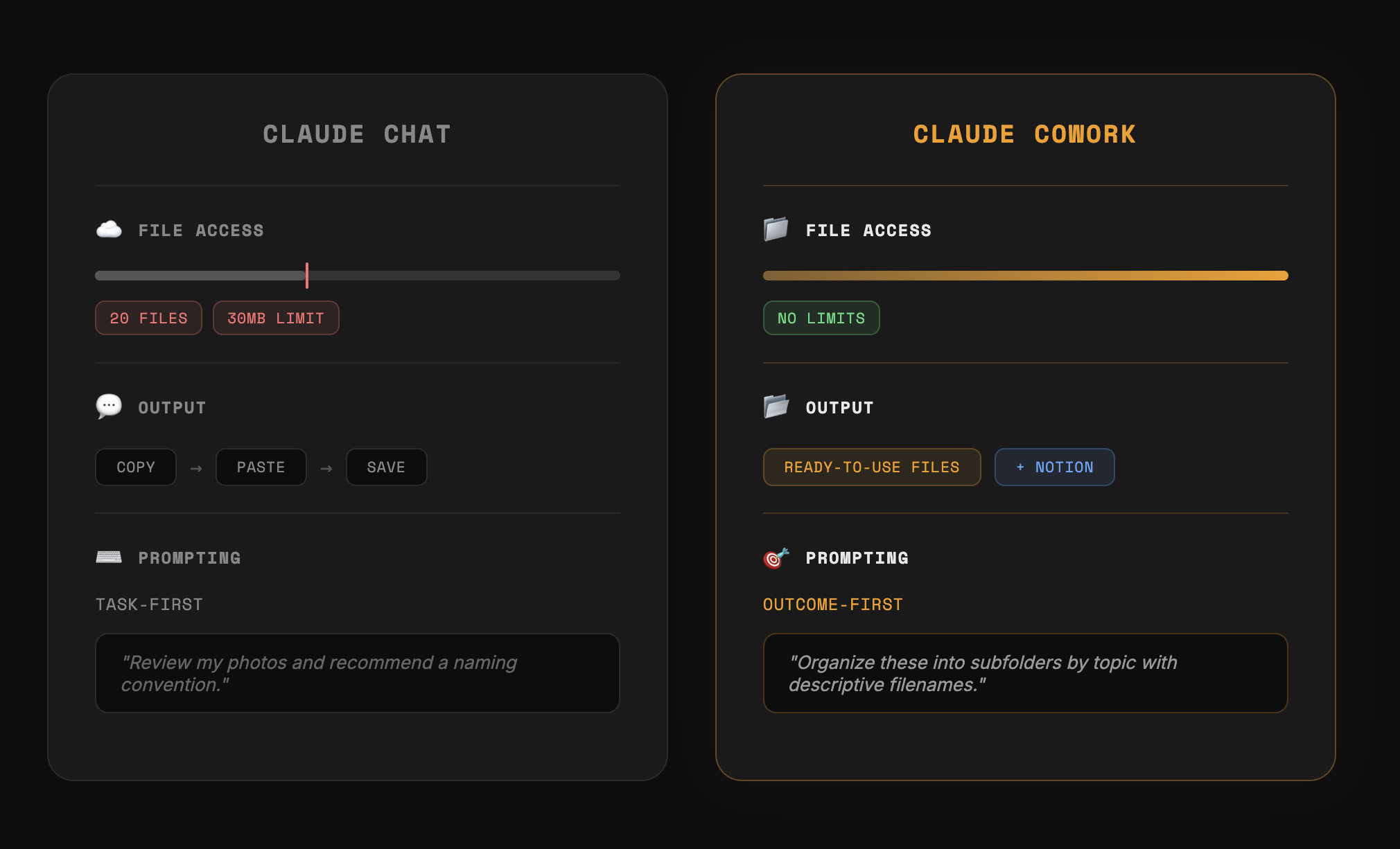 Chat has massive limitations since you need to upload files to the cloud (20 files per conversation, 30MB per file). But since Cowork accesses your local files, neither limitation applies!