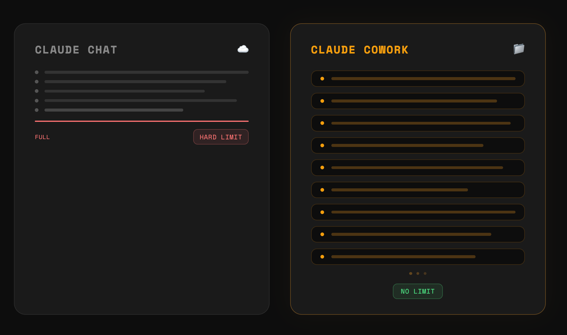 Chat stores memory online with a hard limit on how much it can hold. Cowork saves memory to actual files on your computer, meaning it can remember every decision, every preference, for as long as you need.