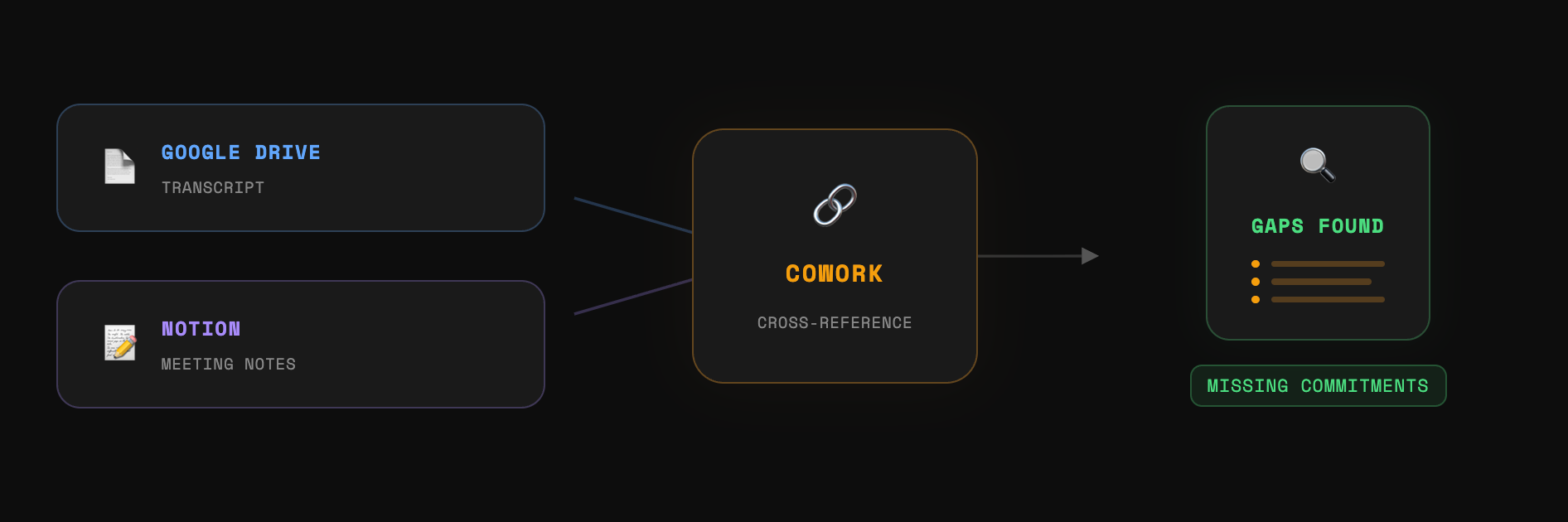 Cowork pulls the transcript from Drive, pulls the notes from Notion, cross-references them, and tells you what's missing.