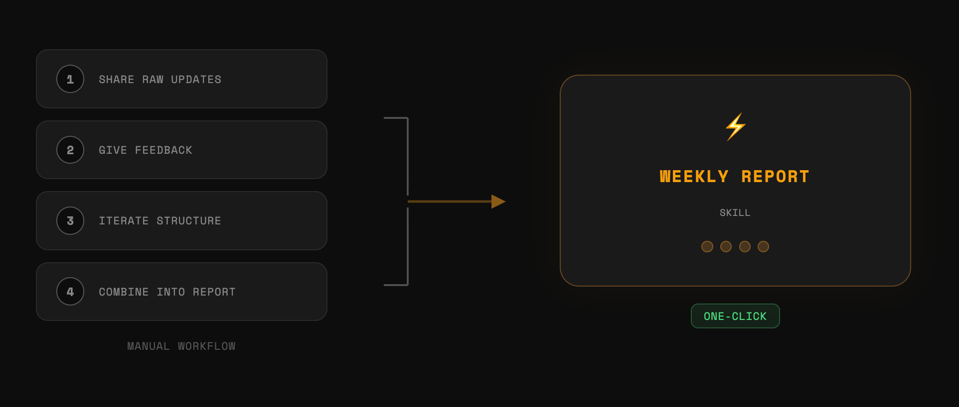 After testing, I installed it via Customize > Skills > Upload a Skill. Now I have a weekly report skill I can trigger anytime.
