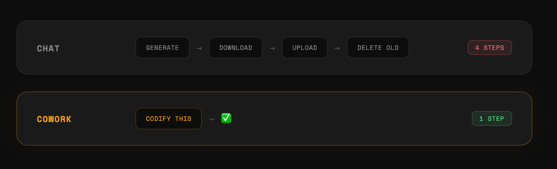Chat gives you a response in a chat window that you copy and download yourself. Cowork delivers ready-to-use files directly in your folder, and can also work inside external platforms like Notion.