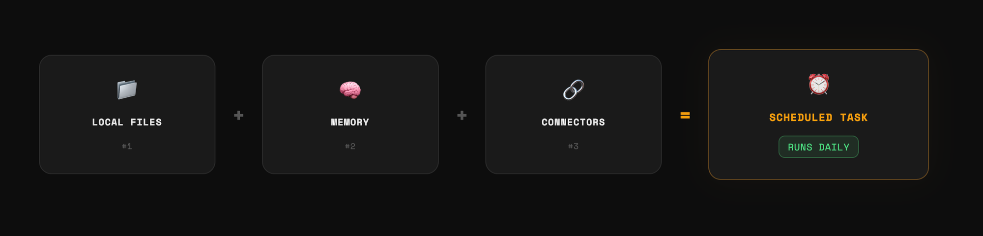 Scheduled tasks aren't new (Gemini and ChatGPT have them), but Claude Cowork's version works flawlessly because of the capabilities we've already covered.