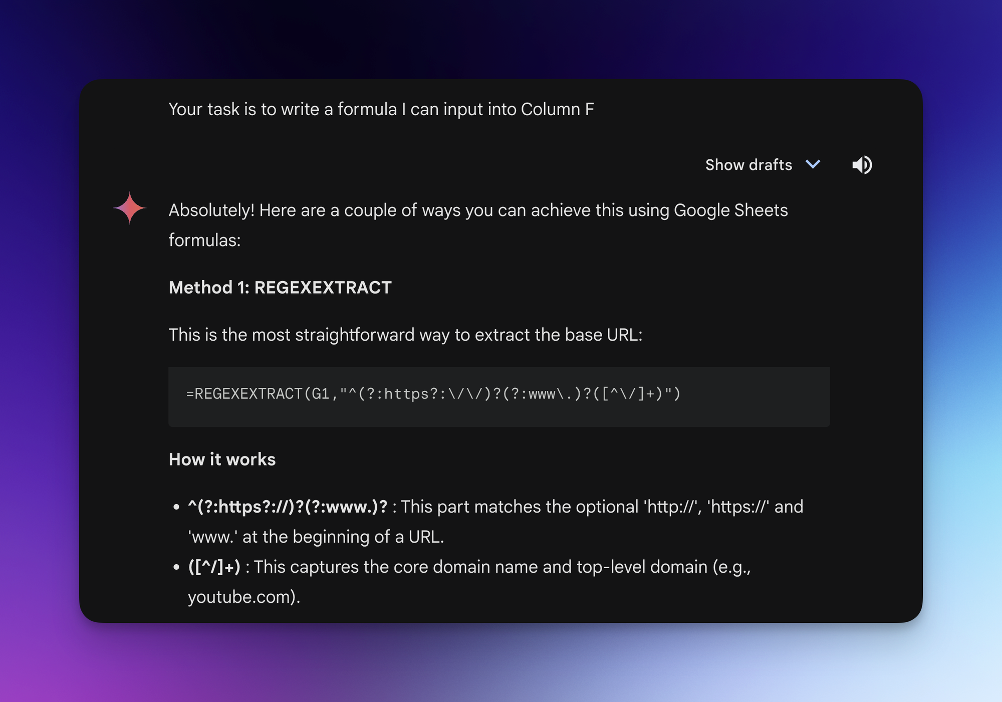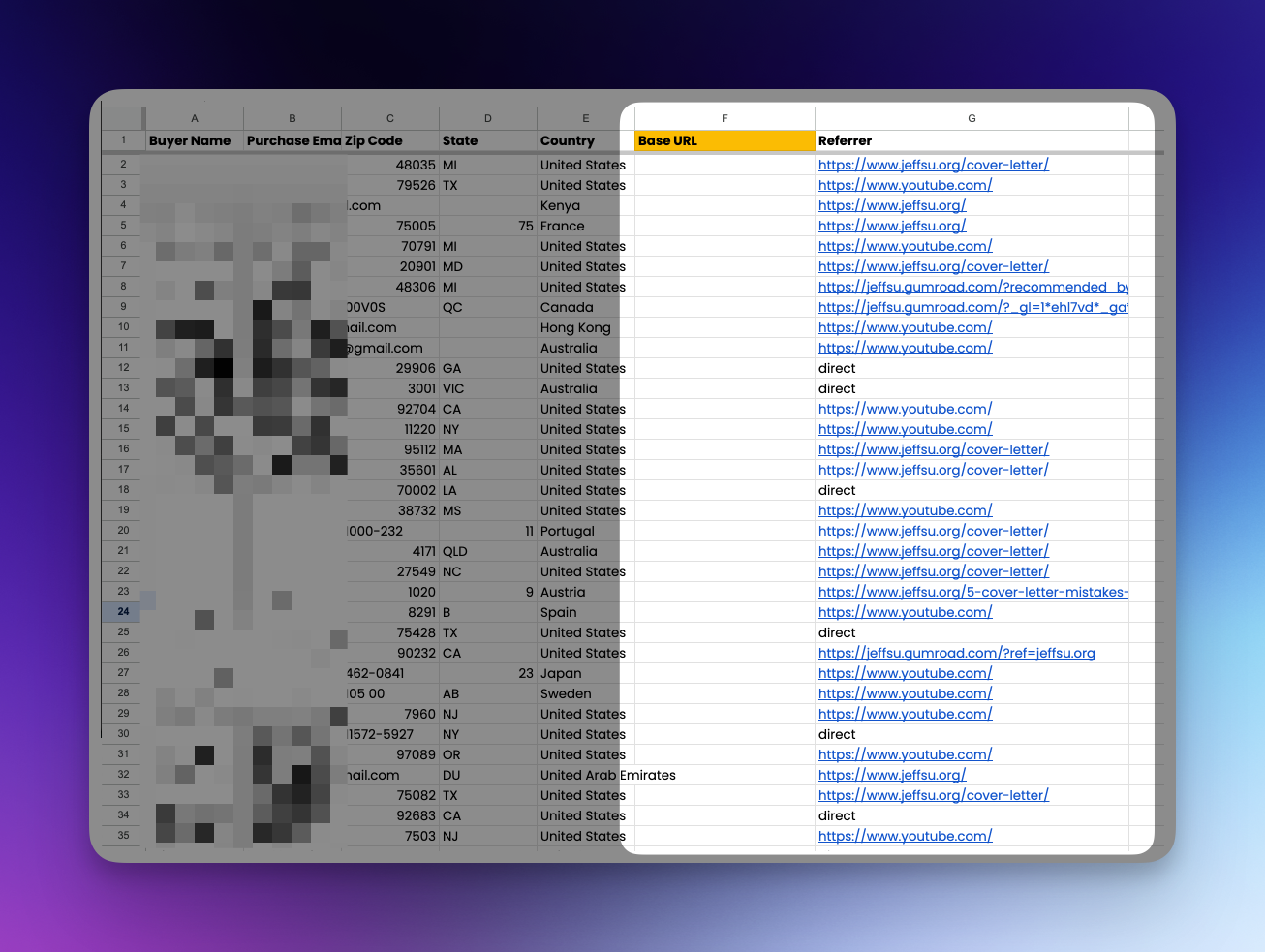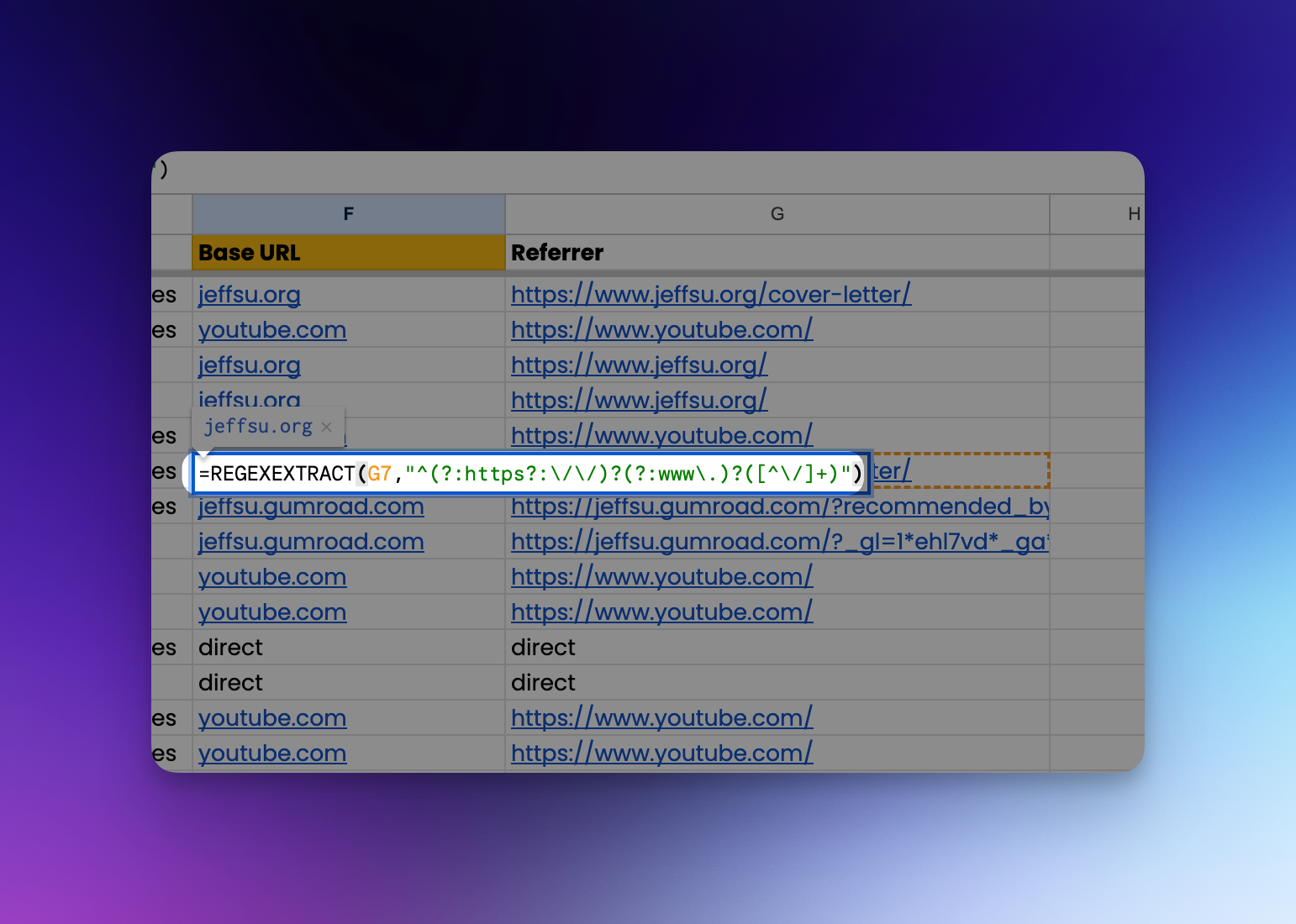 For example, if the website URL is "www.youtube.com/jeffsu", Column F should show "www.youtube.com" as the Base URL.