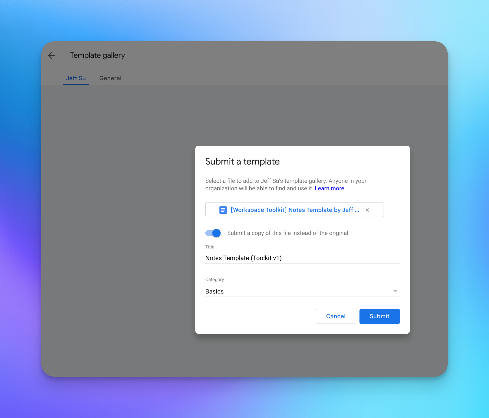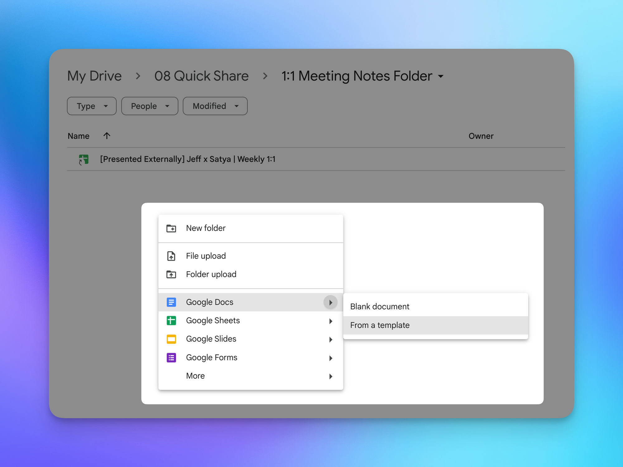 The next time you (or your colleagues) want to use a submitted template, simply right click in Google Drive > hover over the little arrow icon > Click “From a template”