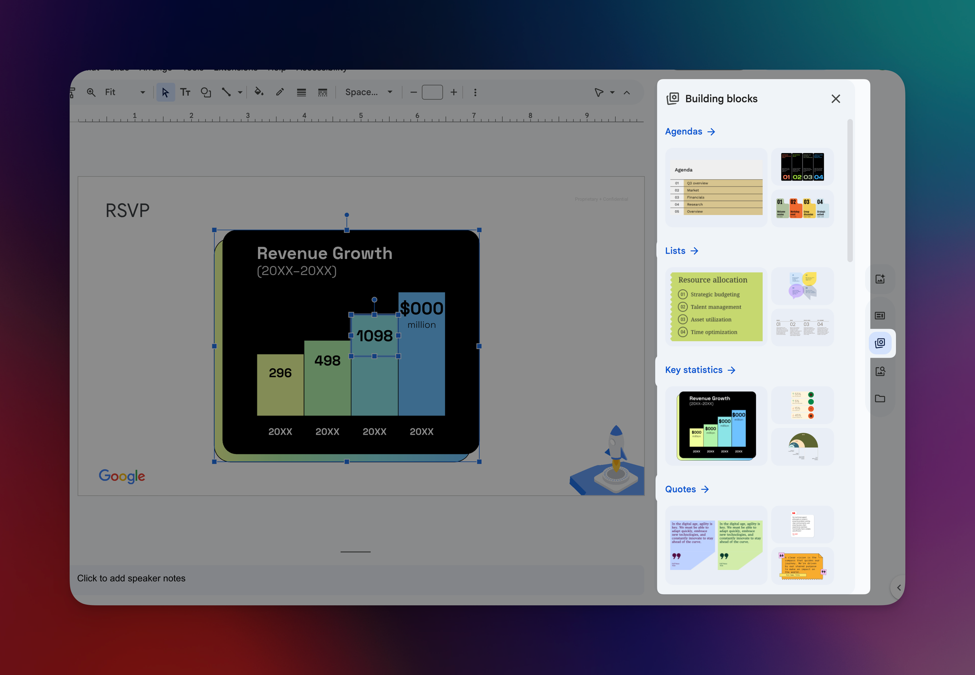 Building blocks is Google's answer to the "formatting friction" that slows down presentation creation. Basically pre-built Lego pieces for our slides.