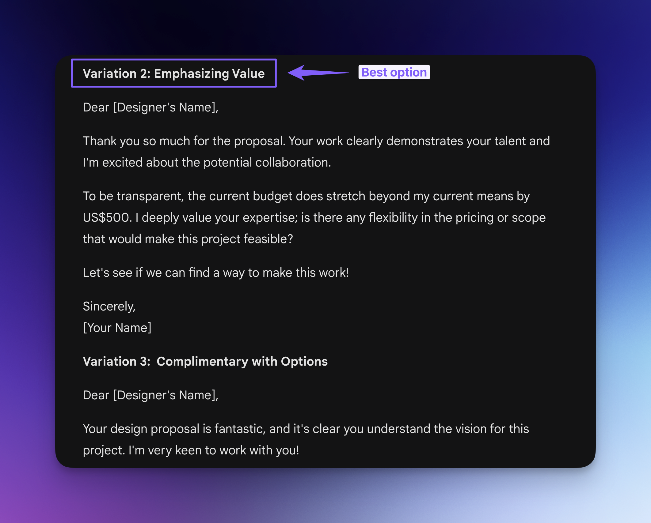 Asking Gemini for 3 variations almost always produces at least one option I'm happy with. And in the worst case? I mix-and-match by taking the best elements from each variation.