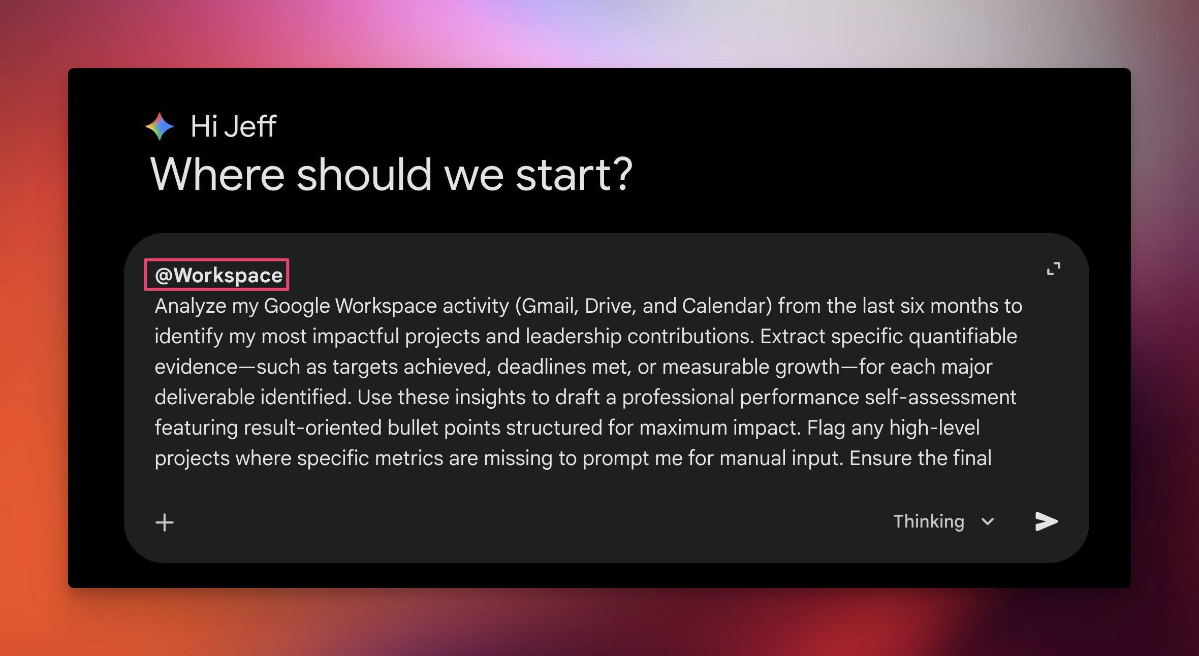 With Gemini 3's enhanced Workspace integration, you can now ask it to search across your Gmail, Drive, Docs, and Calendar all at once and draft your review for you.