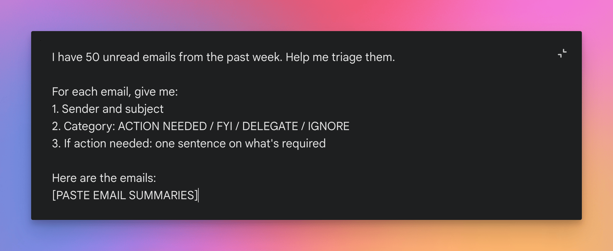 Example: You're a manager with 50 unread emails before a Monday meeting. You need to triage them quickly: what needs action, what's FYI, what can wait.