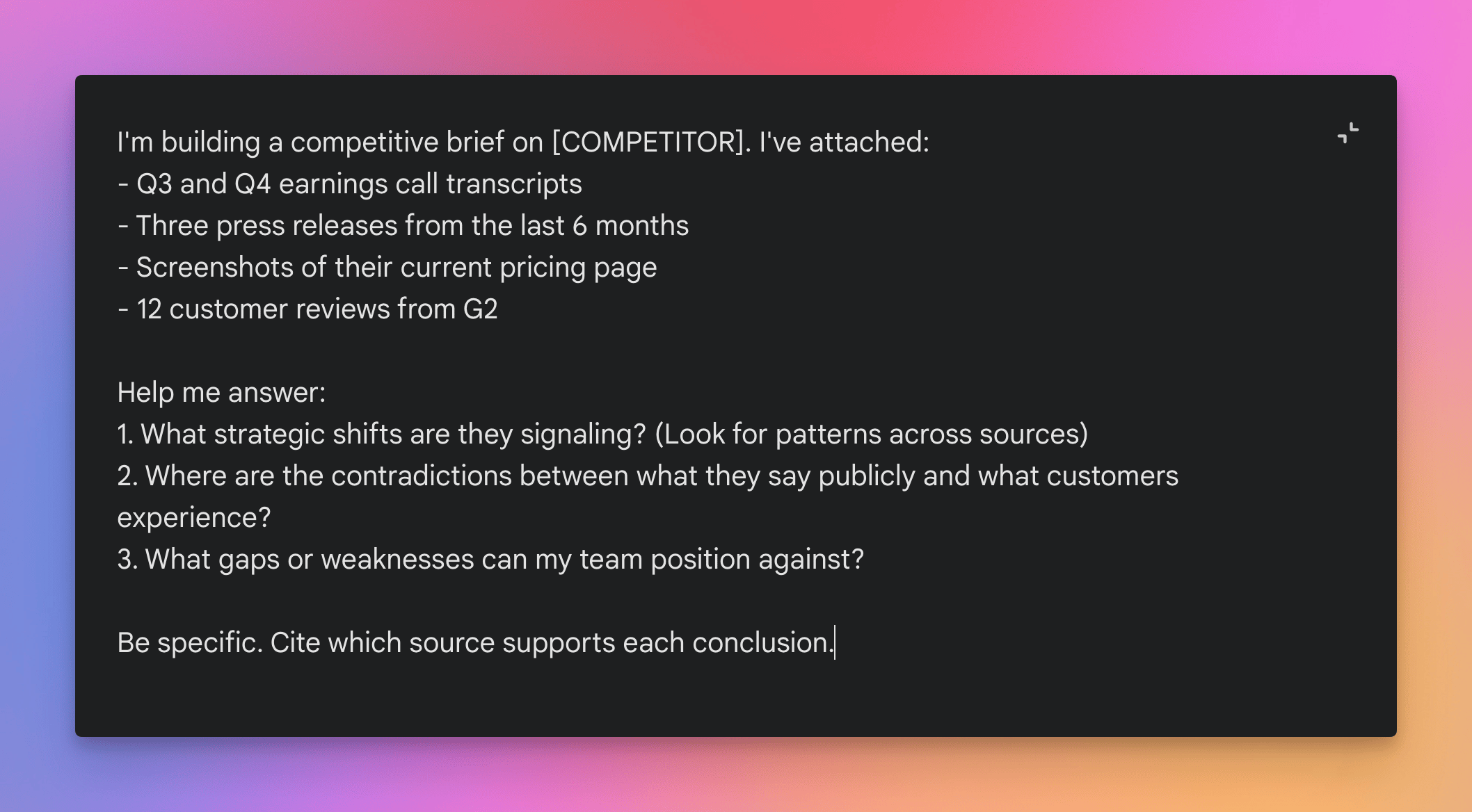 Example: You're a product marketer preparing a competitive brief. You have a competitor's last two earnings call transcripts, three recent press releases, their updated pricing page, and a dozen customer reviews. You need to figure out what their actual strategy is and where the gaps are that your team can exploit.