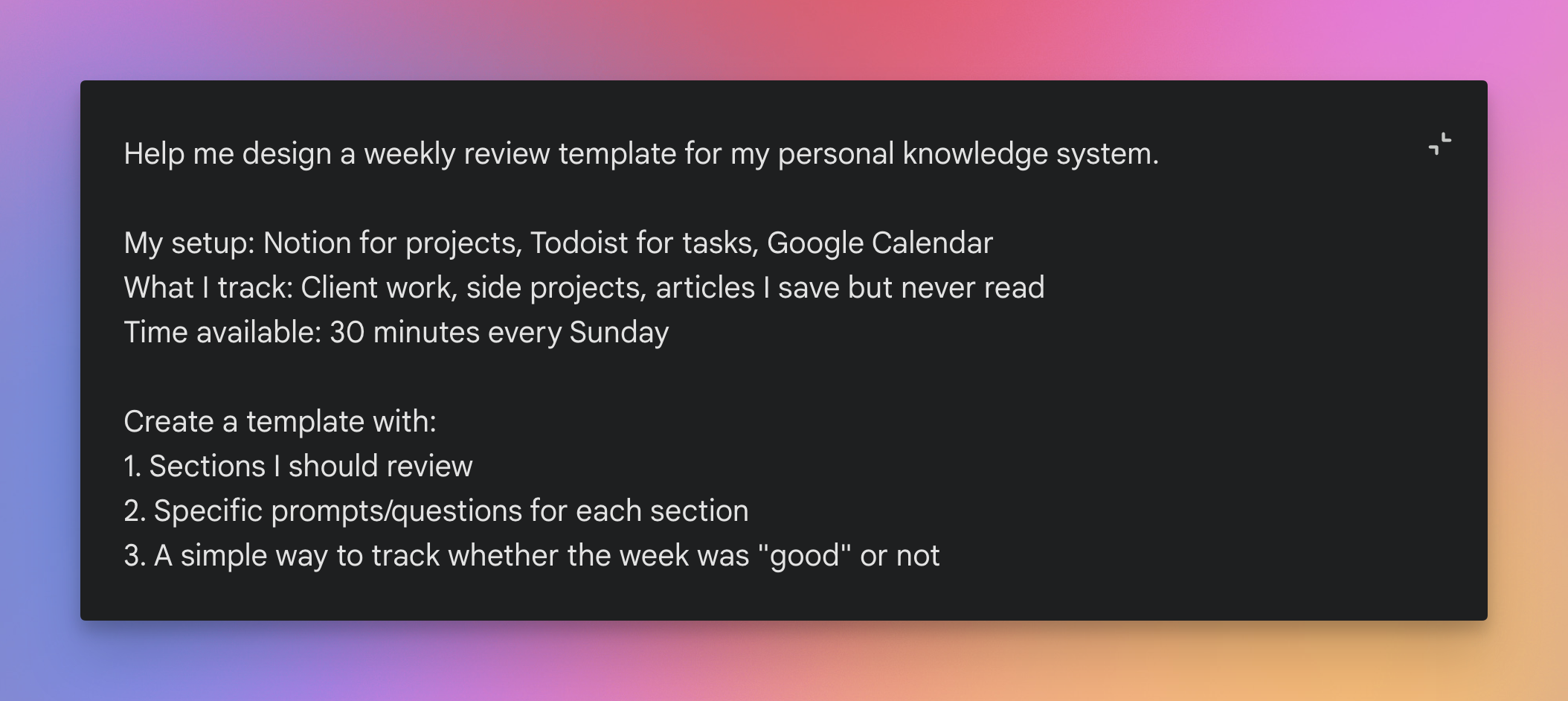 Example: You're a freelancer or knowledge worker building a personal productivity system. You want a weekly review template that actually fits your tools and workflow.