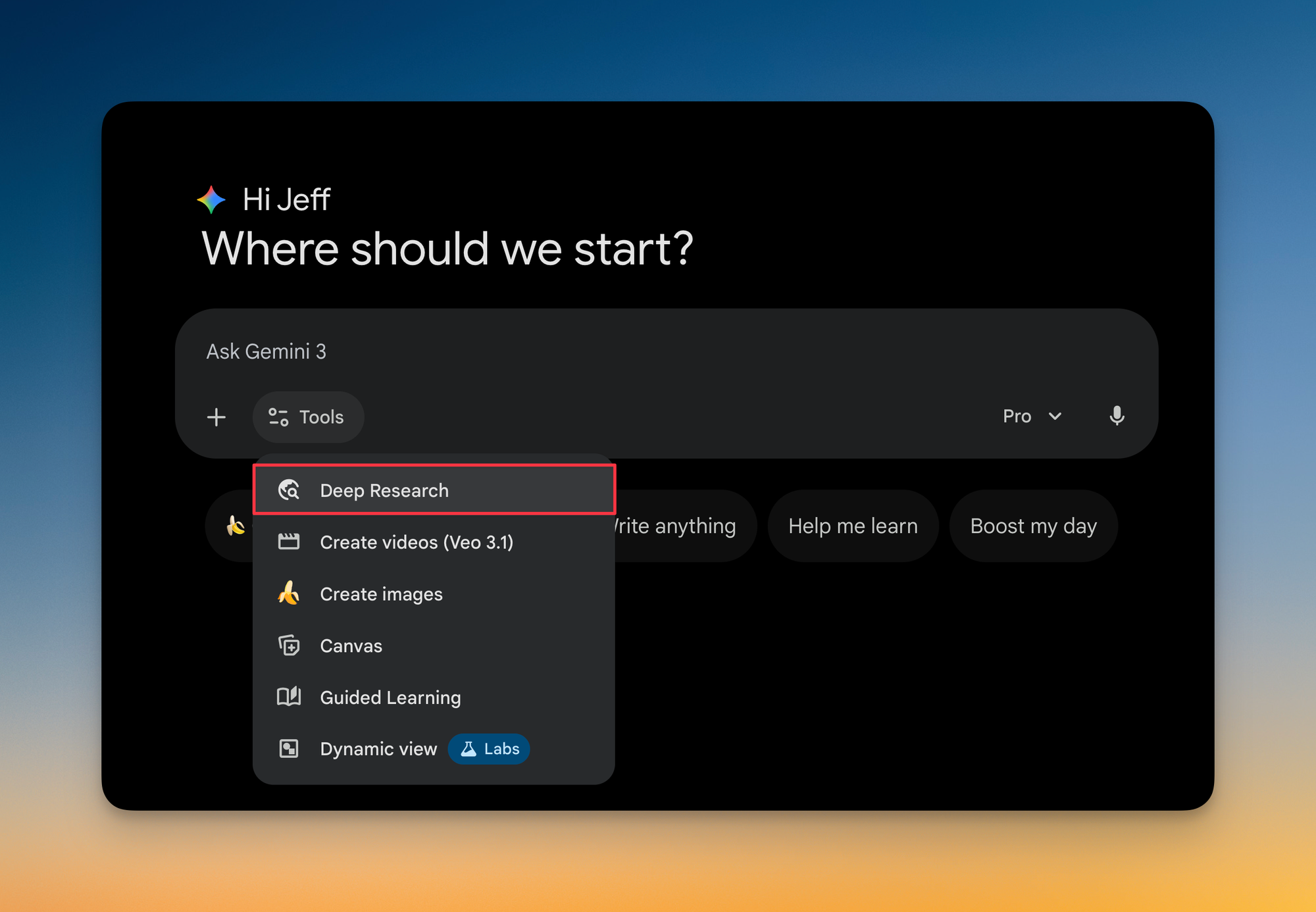 When you enable Deep Research, Gemini can now search the web to supplement your internal files with external context.