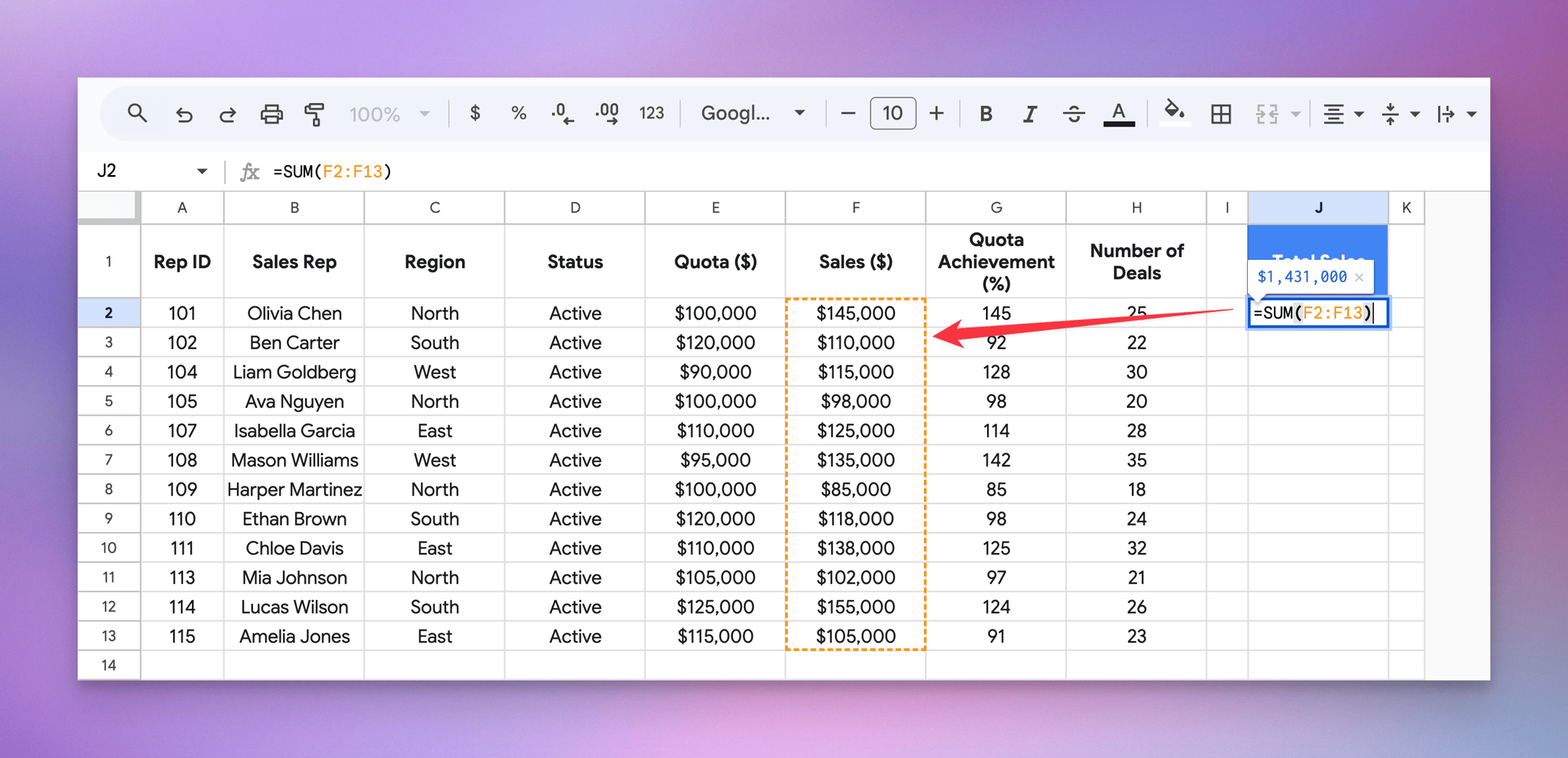Google Sheets tables offer a better solution (thanks to Gemini): Table references. Instead of ‘=SUM(F2:F13)’, you: