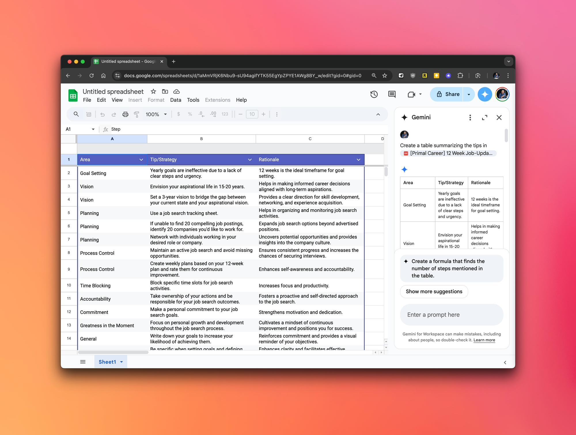 You get the highlights without slogging through a wall of text, and because it's now in Sheets, you can sort, filter, and build on top of it immediately. Try doing that with a PDF (pro tip: you can't).