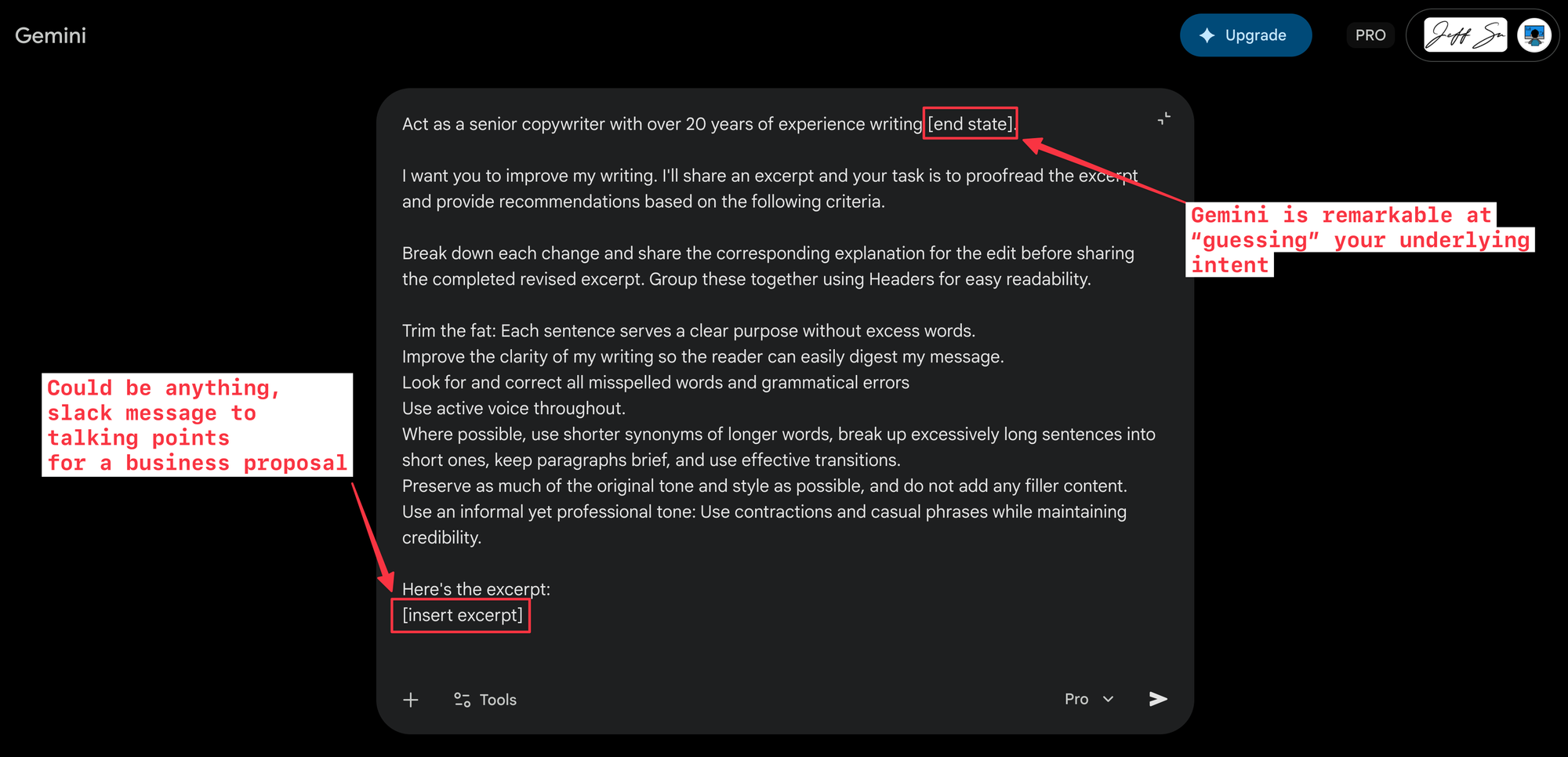 The key is the [end state] in the first line. Swap it out depending on what you're writing, and Gemini adapts its expertise accordingly: