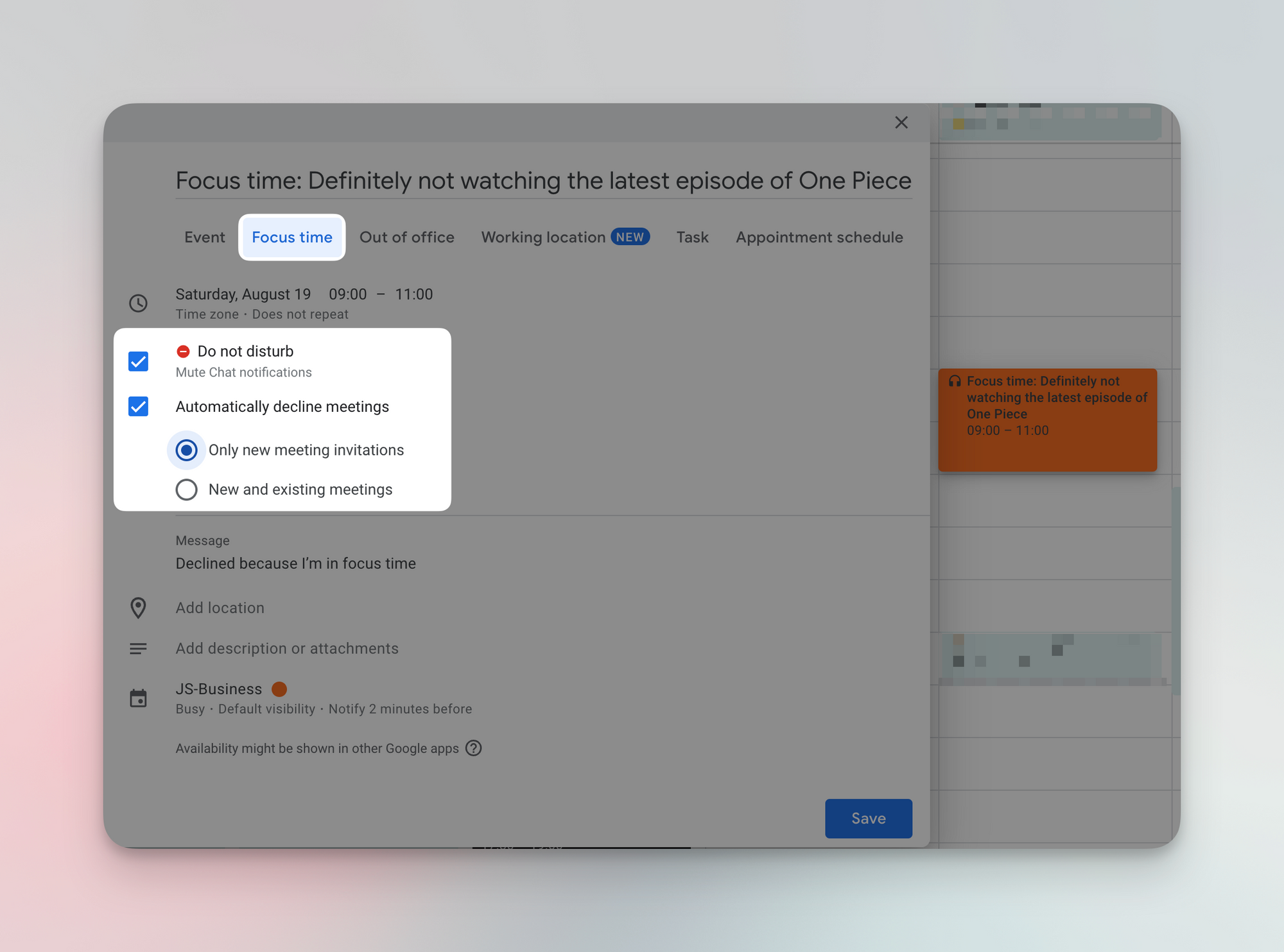 The next time you create a “Focus Time” slot, toggle on “Do Not Disturb ⛔️” and enable “Decline new meeting invitations.”