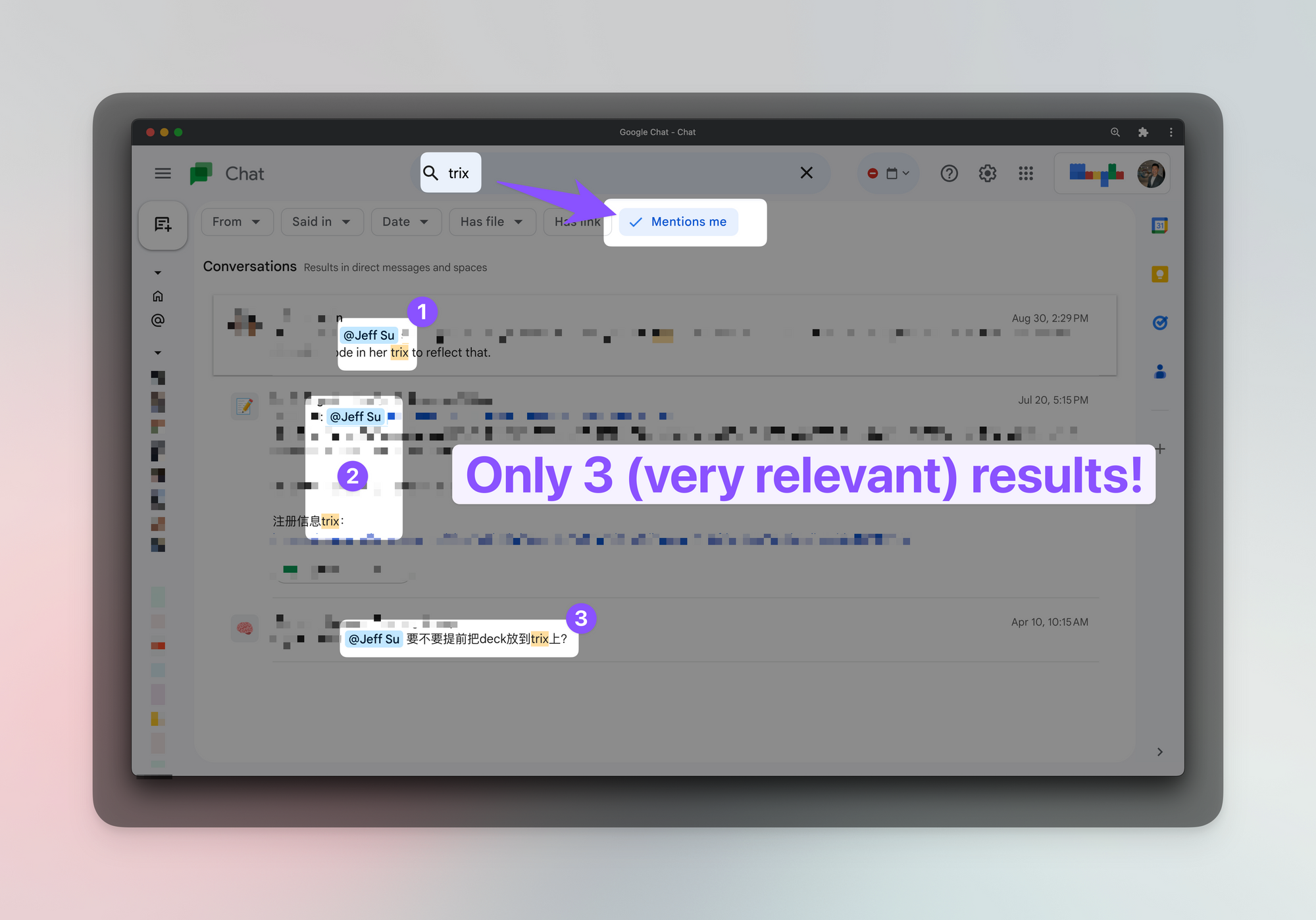 Since I’m in like a thousand group chats (or “Spaces” as Google likes to call it), my favorite Search Chip by far is “Mentions Me.”