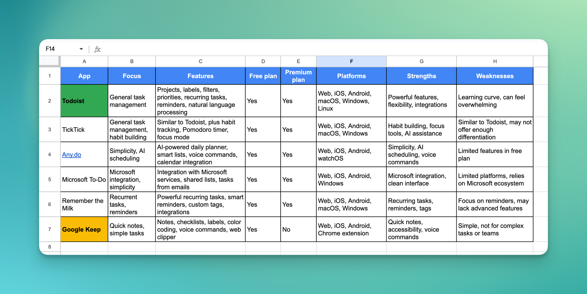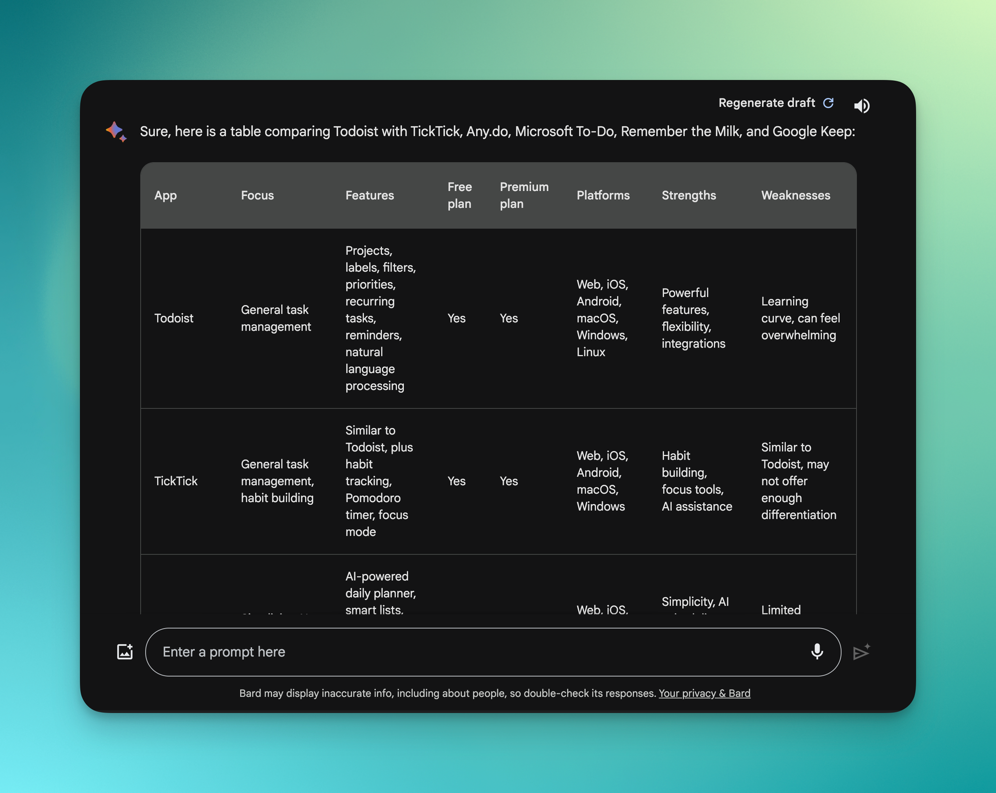 Create a table comparing Todoist with TickTick, Any.do, Microsoft To-Do, Remember the Milk, and Google KeepYou technically can prompt Bard with something like “Create a table comparing Todoist with its closest competitors” but I wanted slightly more manual control (e.g. I didn’t want to include Evernote or Trello in the table for example).