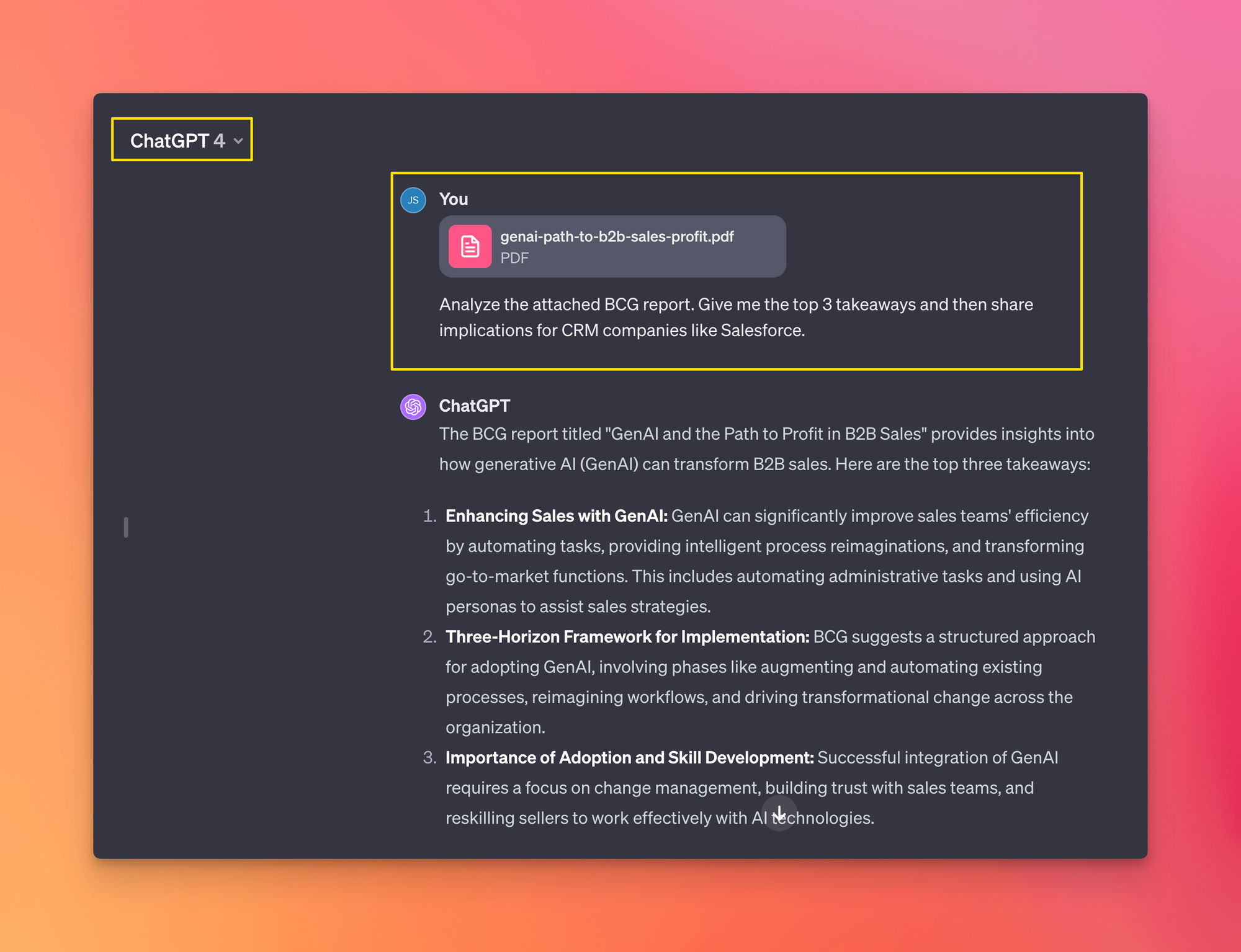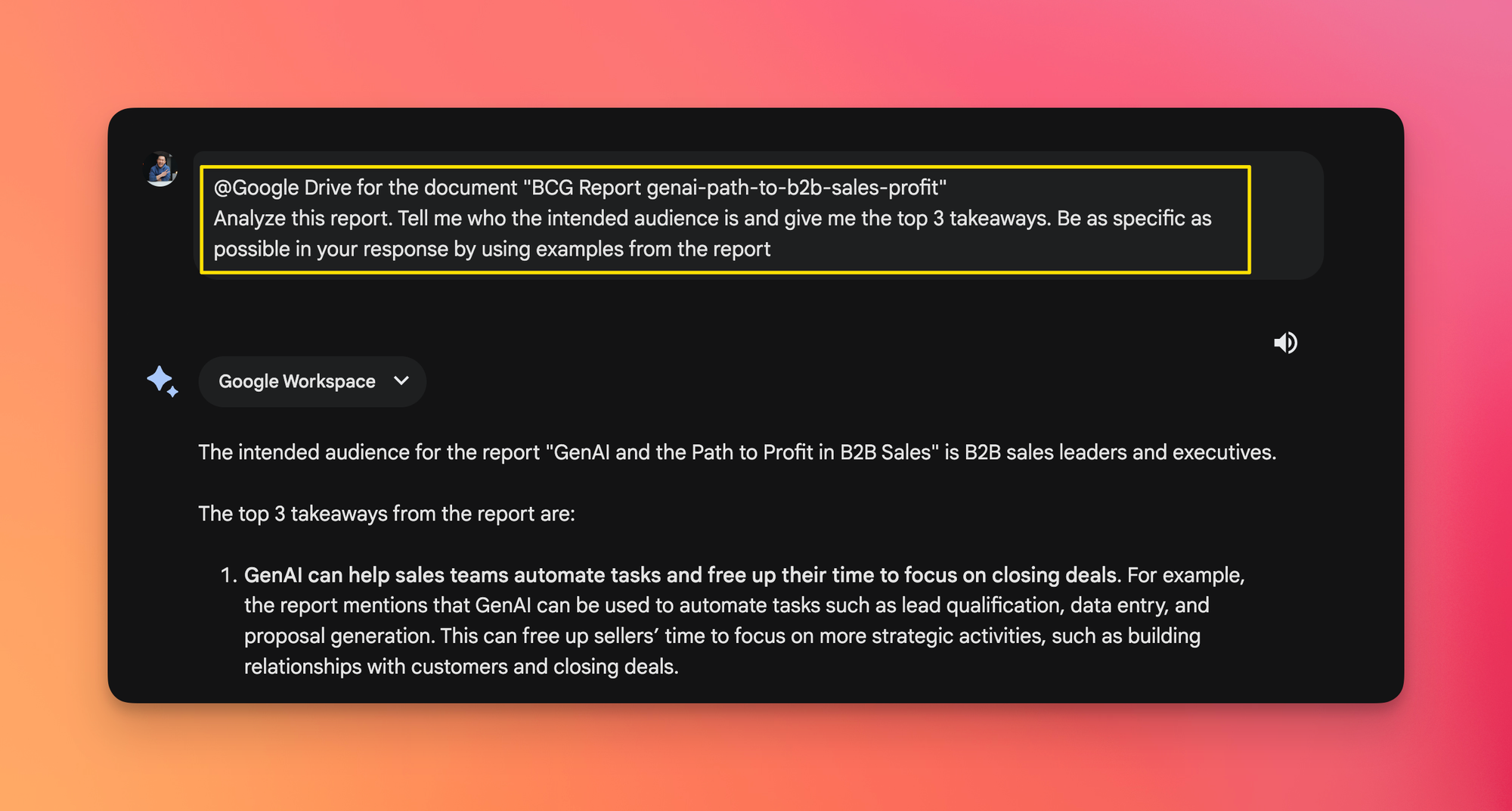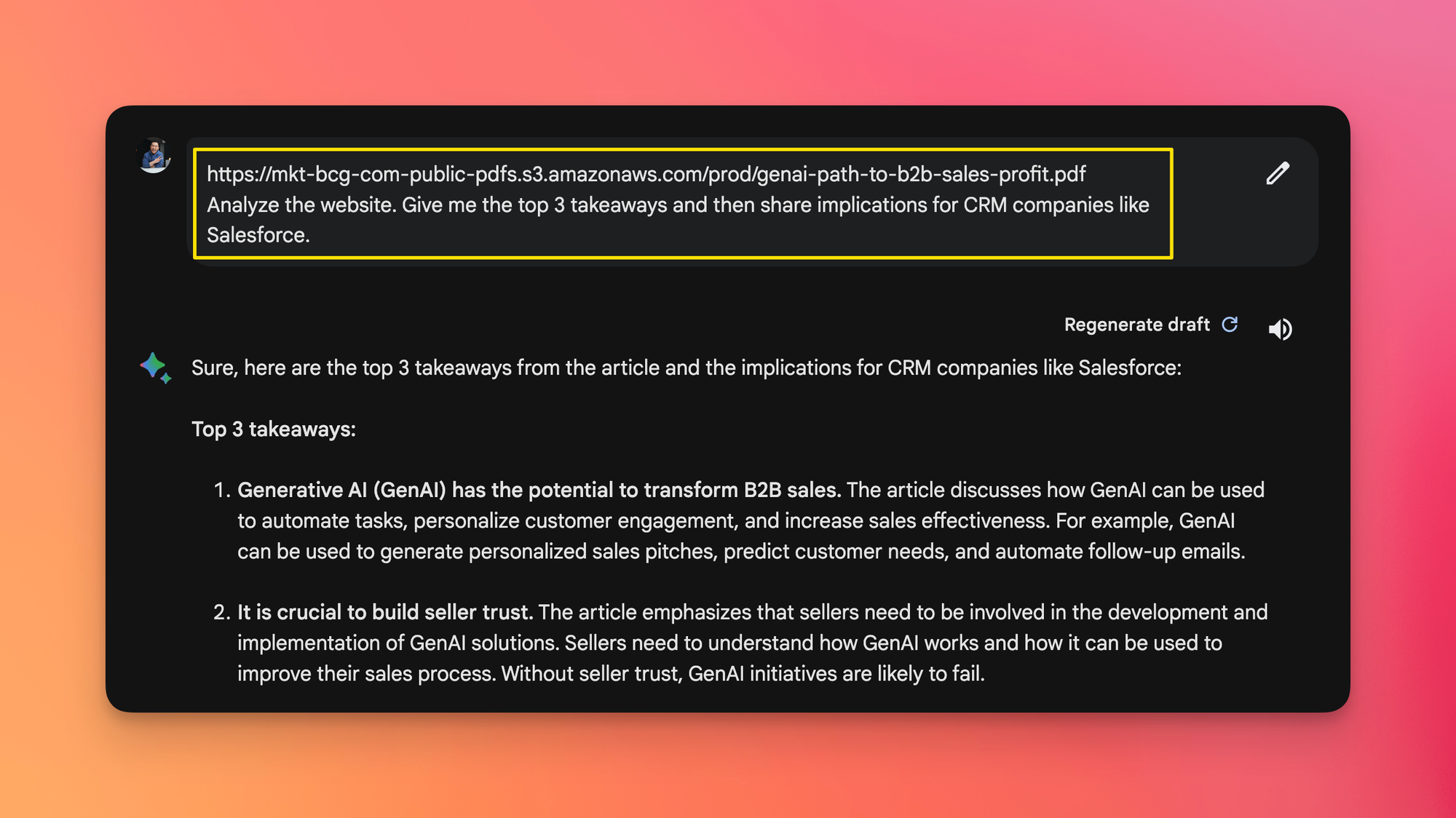 If the PDF is already being hosted online (e.g. this BCG report), simply paste the URL within Google Bard: