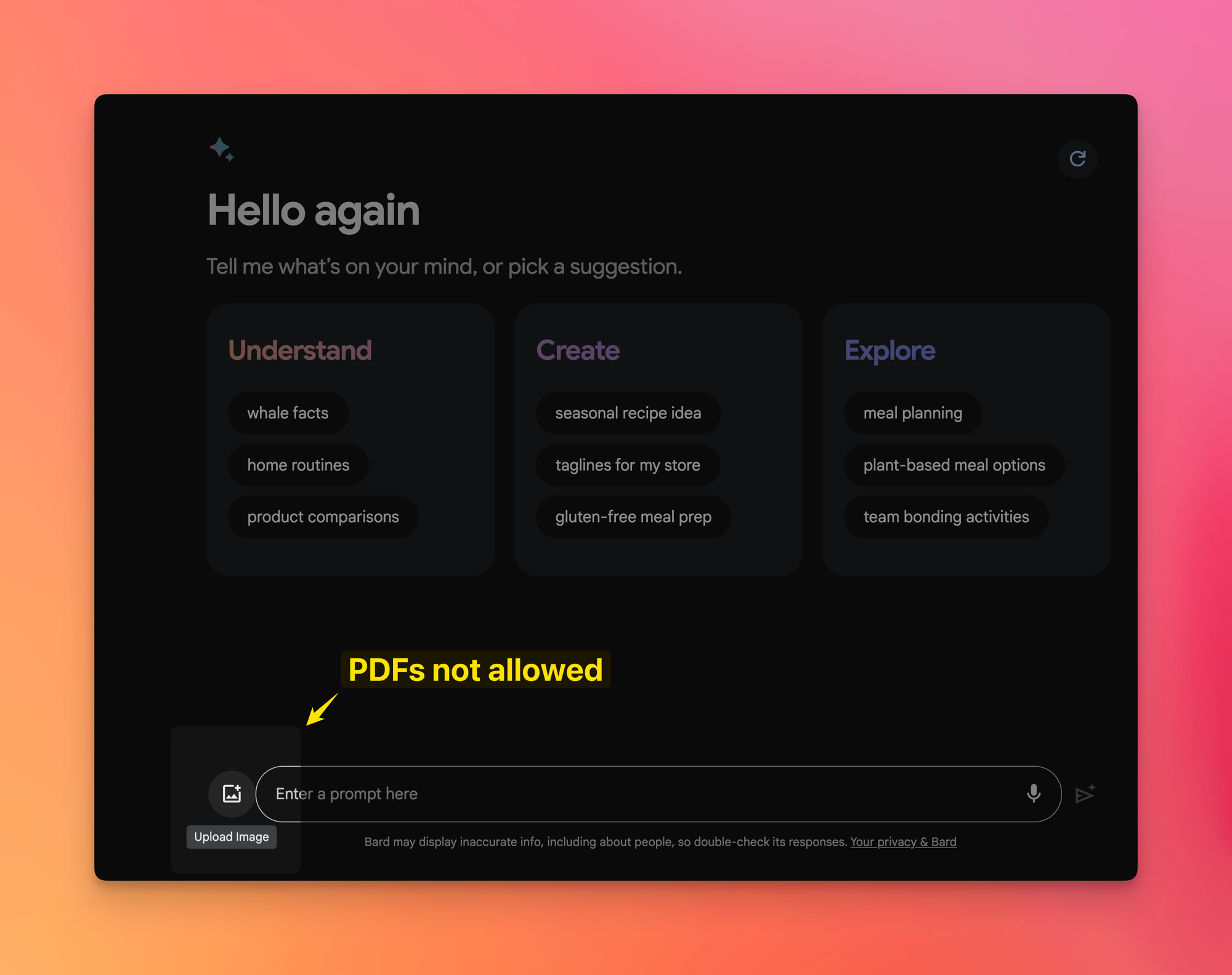 Just like the free version of ChatGPT, users are not allowed to upload PDFs onto Google Bard.