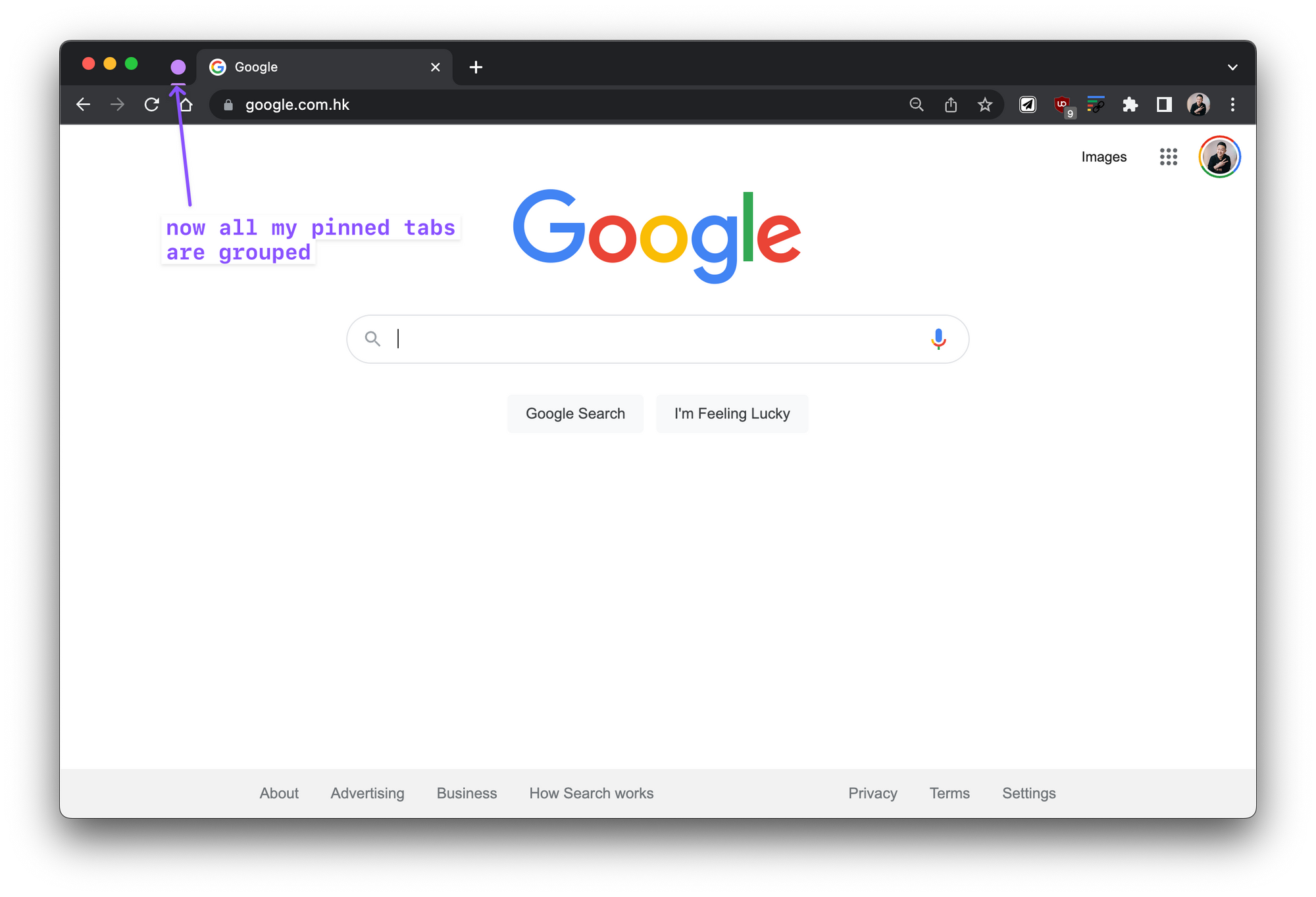 I recently found out if you “Add Tabs to New Group” WITHOUT giving it a name, you will only see a colored dot for a very minimal look (all your pinned tabs are now hidden within that group)