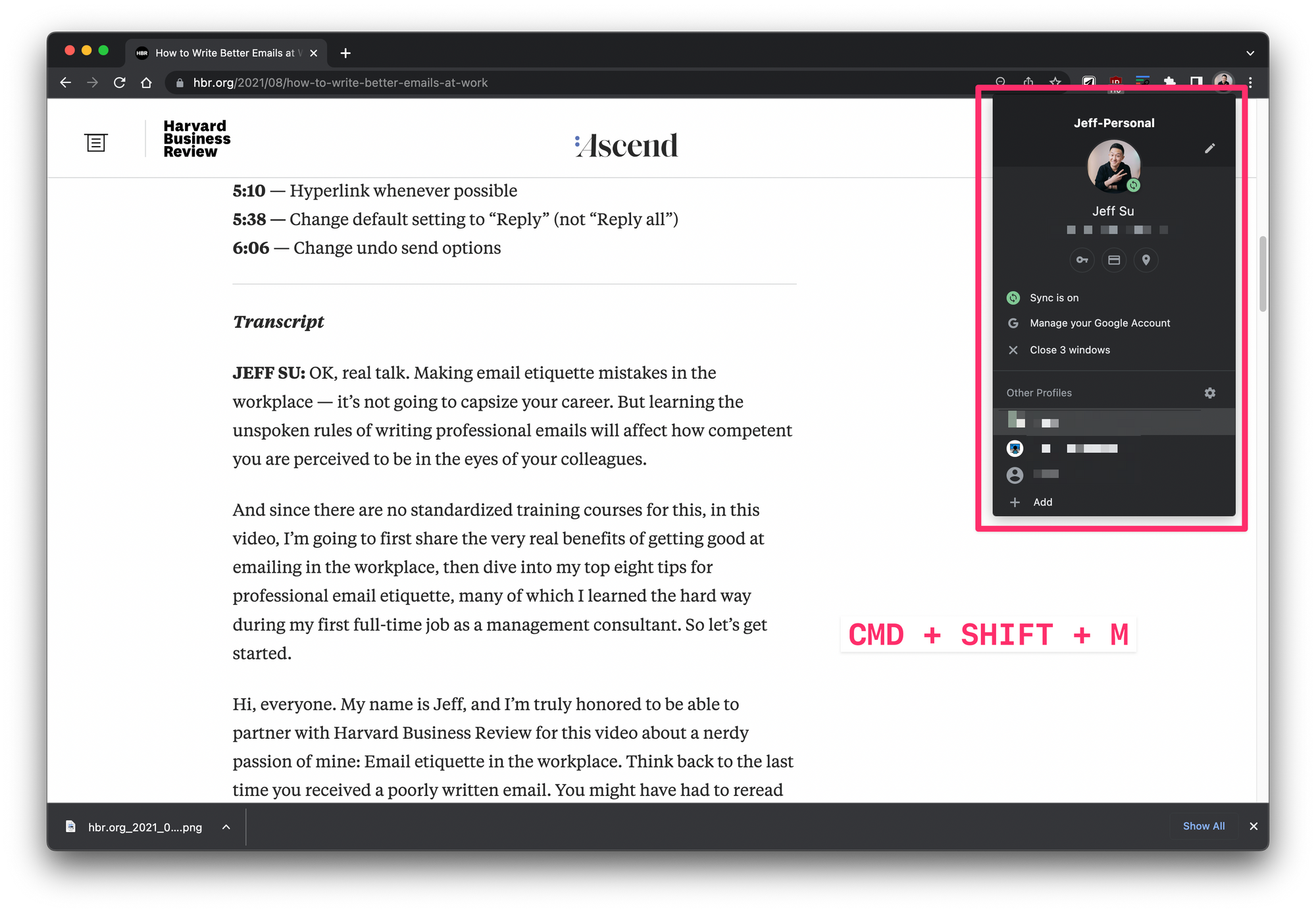 - CMD + SHIFT + M (CTRL + SHIFT + M on windows) to bring up your different Chrome profiles!
