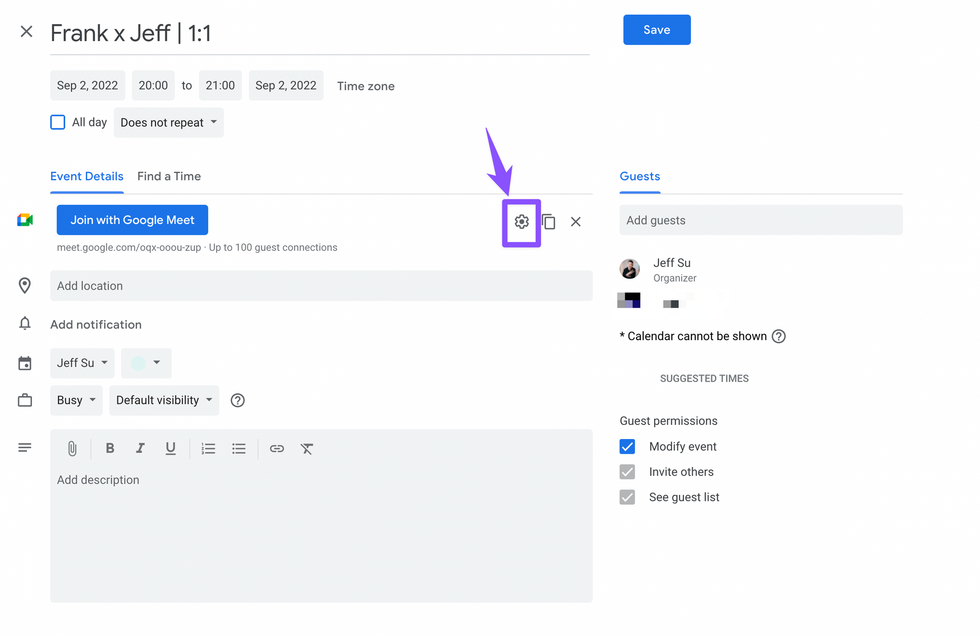 If you’re giving a formal presentation and want to make sure only select people (i.e. the presenters) can share their screens, you can enable Host Management directly from the Google Calendar invite to avoid an audience member presenting their screen by mistake (trust me, it happens)