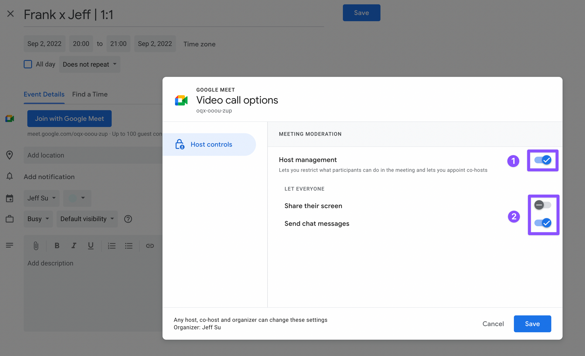 You can enable the Host Management setting directly in the Google Calendar invite (aka before the meeting even starts) to avoid potential issues during the meeting